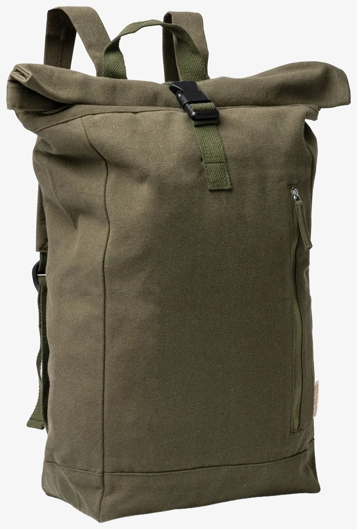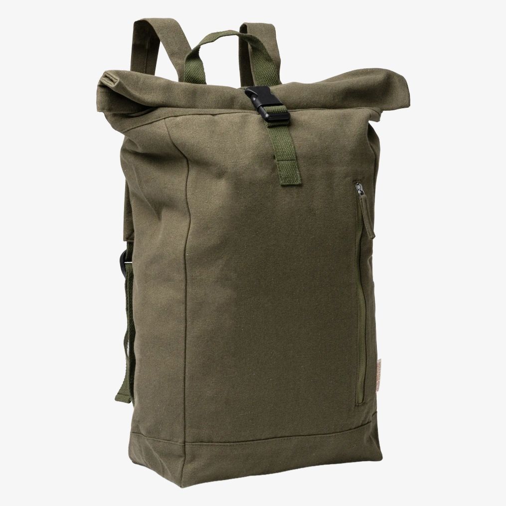 La mochila de algodón reciclado incluye un gran compartimento principal con apertura extensible y cierre de cremallera. Cuenta con un bolsillo delantero con cierre de cremallera y un bolsillo lateral. Su capacidad es de 25 L.