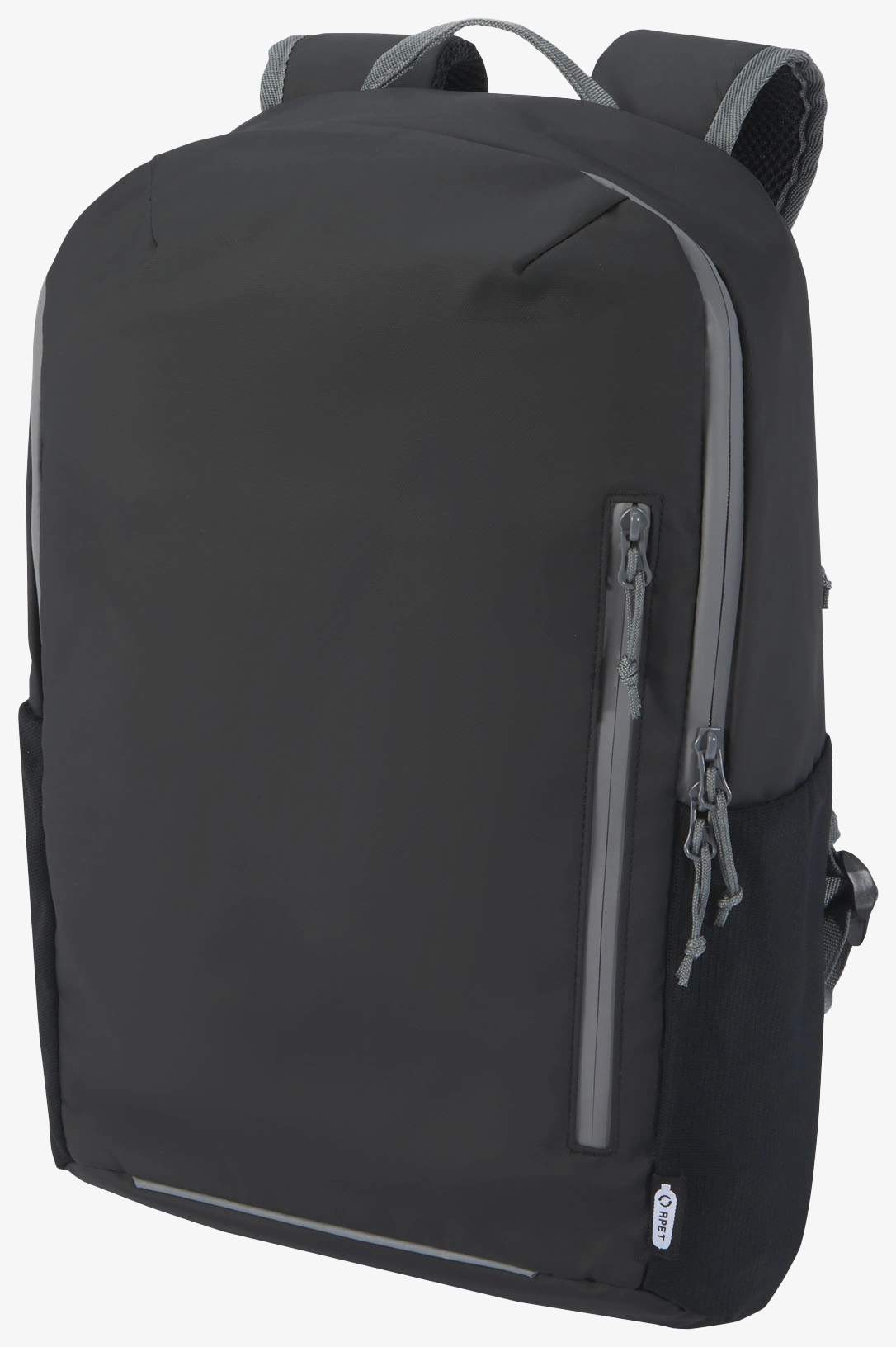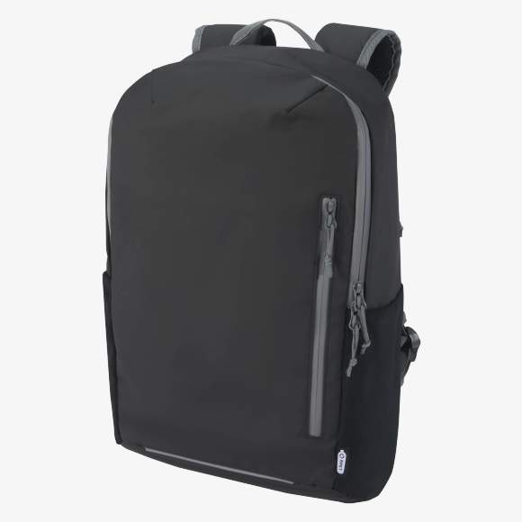 La mochila para portátil de 15 pulgadas está fabricada en poliéster reciclado resistente al agua. Incluye un compartimento acolchado con apertura lateral para acceso rápido, varios bolsillos de malla, un bolsillo delantero con cremallera y un ribete reflectante para visibilidad. El soporte moldeado acolchado y la correa de pecho ajustable garantizan un transporte cómodo incluso cargado.