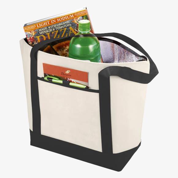 La bolsa isotérmica no tejida Lighthouse 21L presenta un gran compartimento principal para mantener las bebidas frías. Está equipada con asas de 28 cm para facilitar el transporte al hombro. Un bolsillo frontal abierto y una anilla para bolígrafo completan sus funcionalidades. La bolsa está fabricada en plástico polipropileno no tejido.