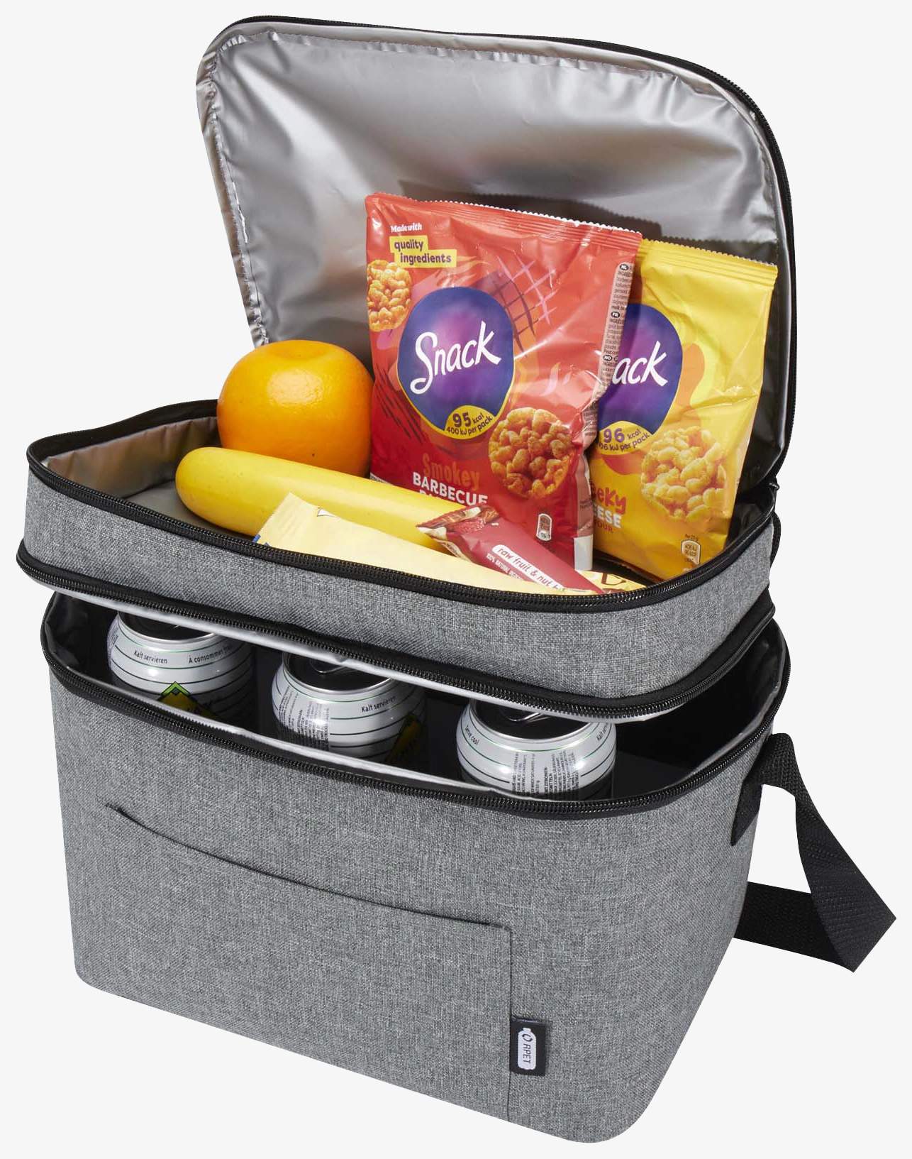 El sac isotherme Tundra rPET 13L incluye un compartimento superior con cremallera y un gran compartimento principal con correas ajustables. El forro es de poliéster reciclado PEVA. Su capacidad es de 13 litros.
