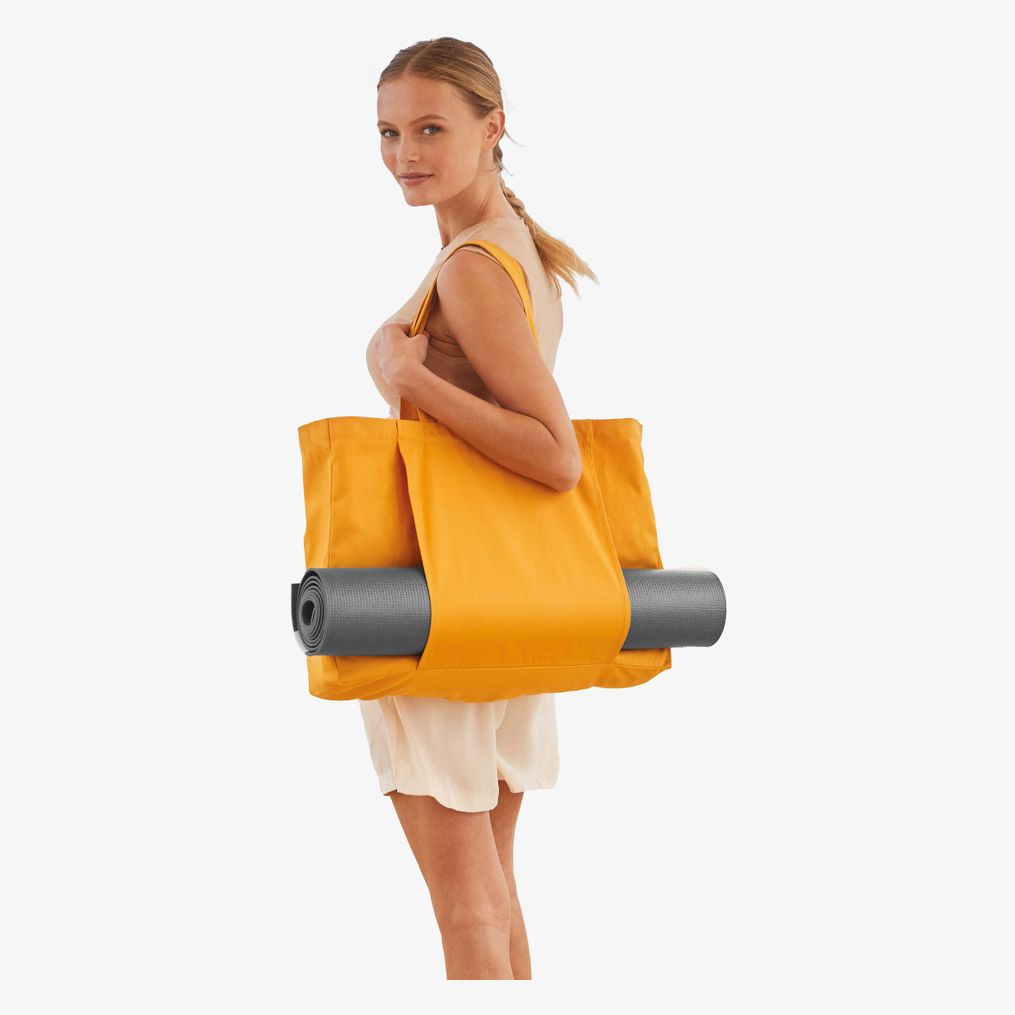 El bolso tote de algodón orgánico permite transportar un tapete de yoga con un bolsillo externo accesible y asas de 57 cm para llevar a mano o al hombro.