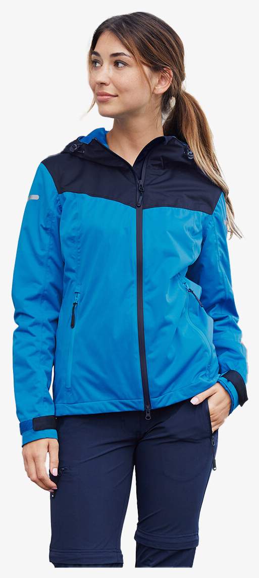 La chaqueta softshell exterior para mujer es ligera y ligeramente acolchada con un corte ergonómico y una sección trasera extendida. El tejido de poliéster reciclado integra una membrana TPU hidrófuga y transpirable. La cremallera bidireccional está cubierta y protegida en la barbilla, con costuras selladas. La chaqueta incluye una capucha ajustable, dos bolsillos laterales, un bolsillo interior y una banda autoadherente en las mangas.