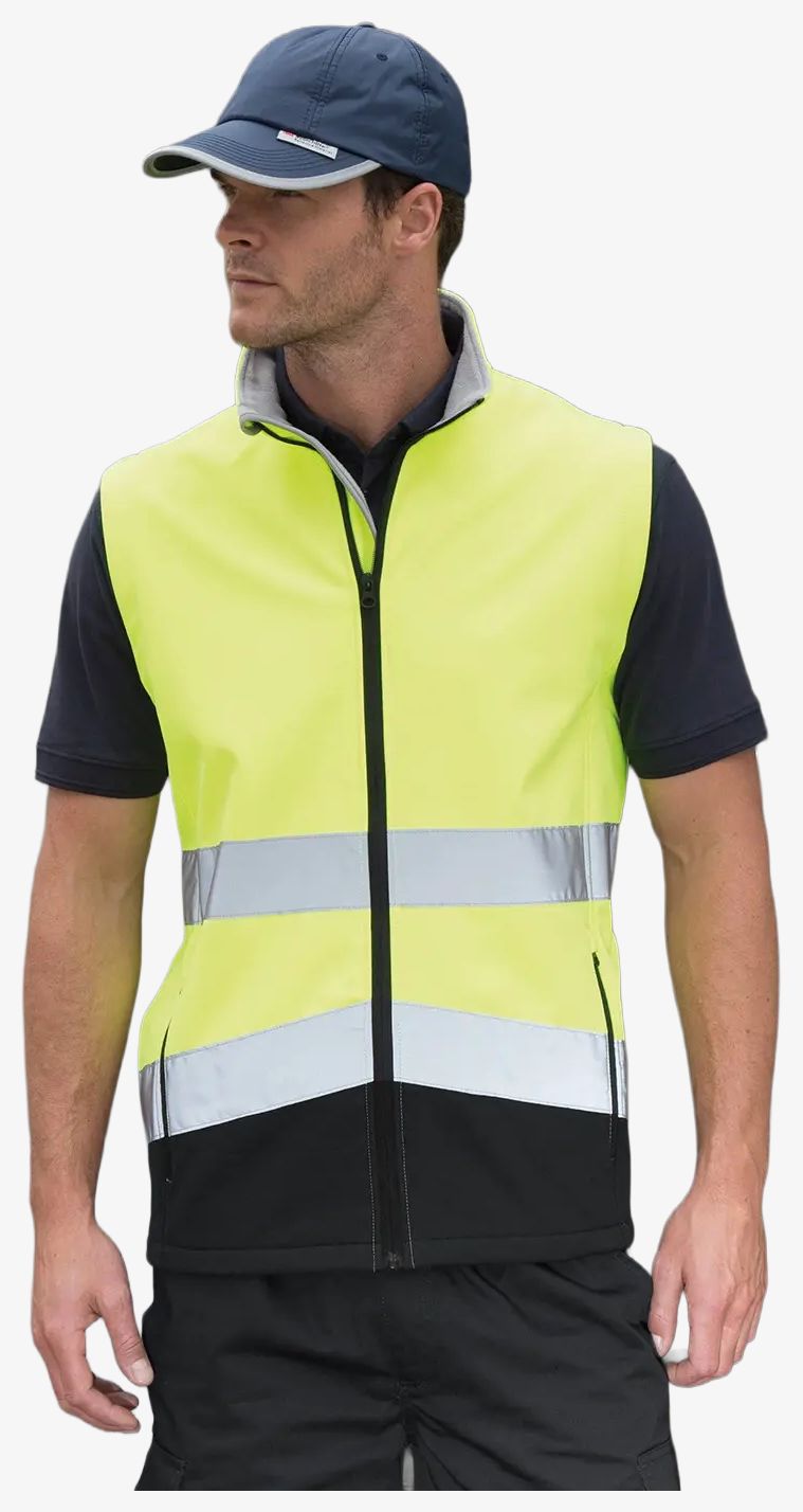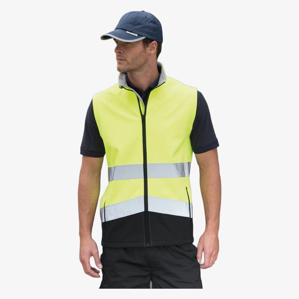 El chaleco softshell de seguridad es un bodywarmer softshell ligero y cálido, diseñado para uso exterior con cuello alto, bolsillos laterales con cremallera, bandas reflectantes en el cuerpo y parte inferior negra menos sucia.