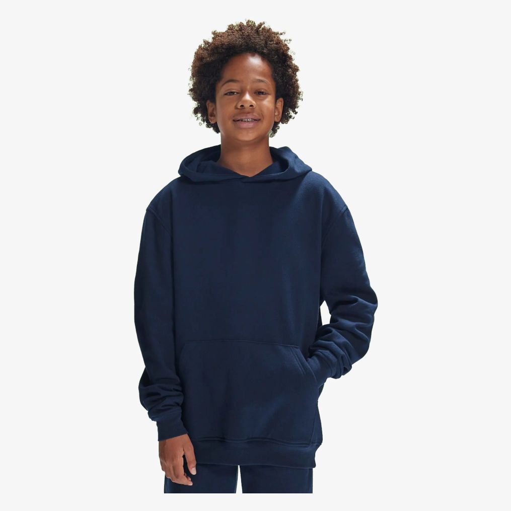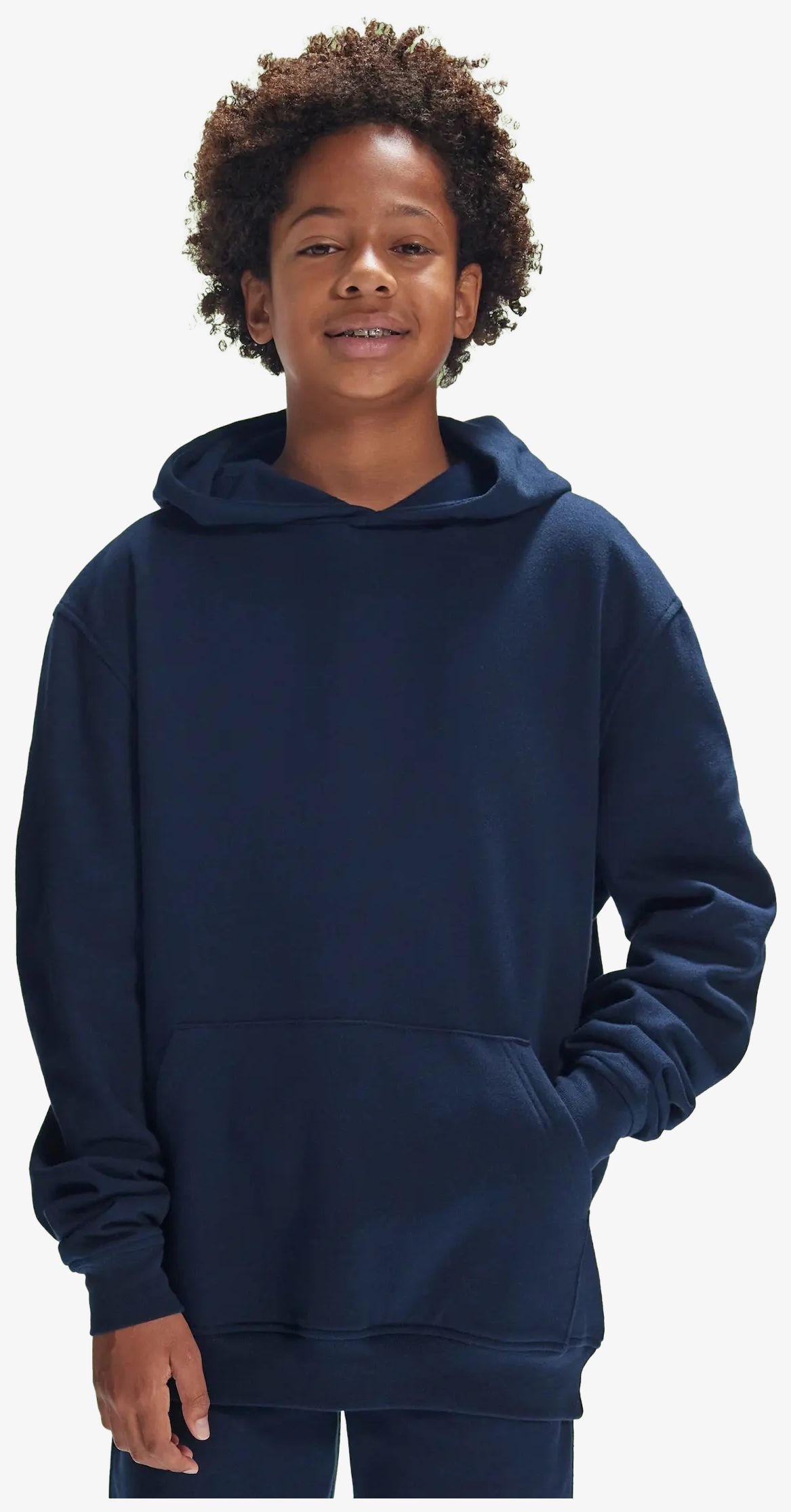 La sudadera con capucha para niño presenta un interior polar cepillado y un corte clásico relajado. Incluye un bolsillo canguro y una capucha forrada en jersey sin cordón de ajuste. Los puños y el dobladillo son de canalé 1x1 con elastano.