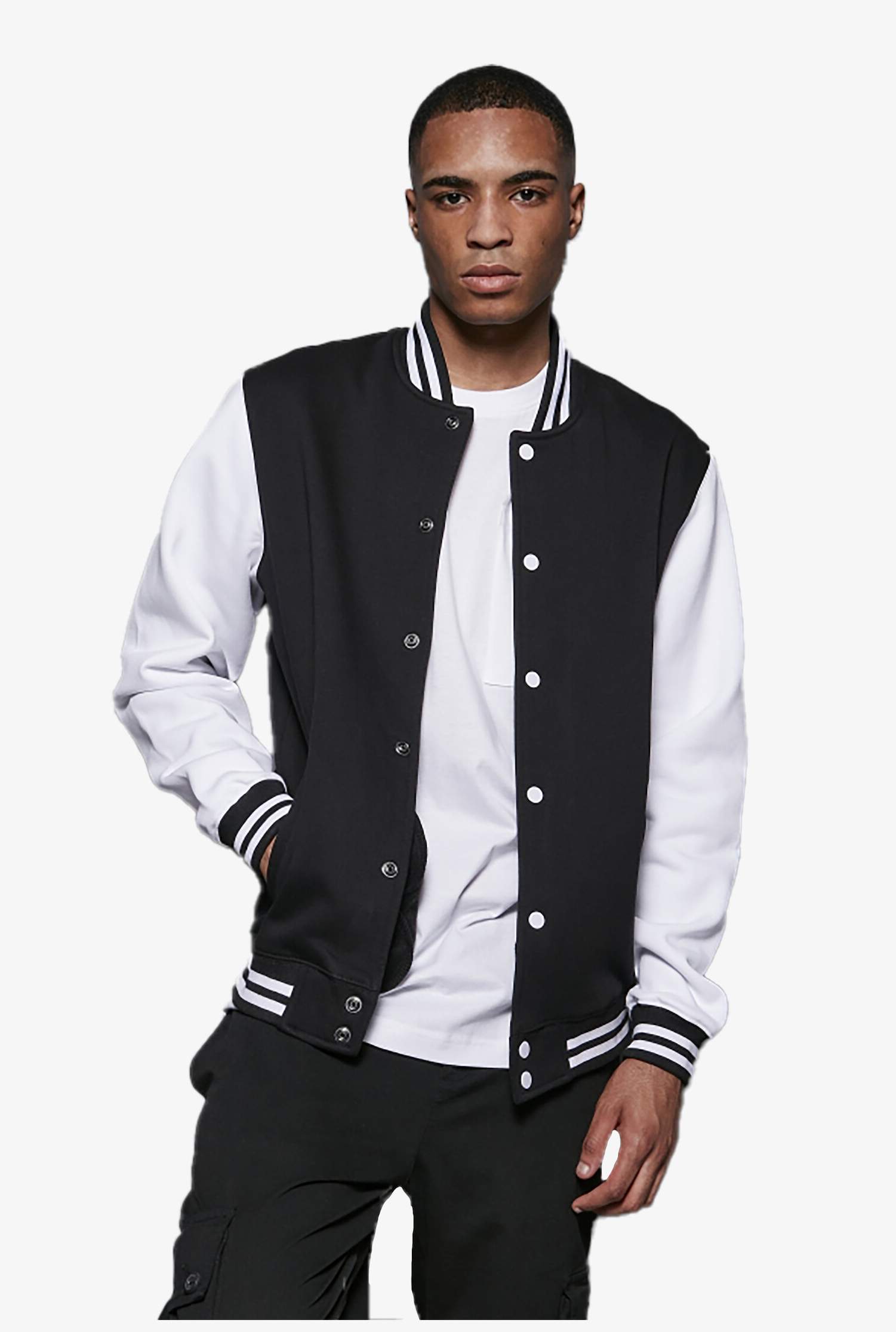 La chaqueta universitaria básica presenta un cuello acanalado y un corte regular relajado. Integra elementos de tejido acanalado en las mangas y el dobladillo de la cintura. La tapeta continua está equipada con botones metálicos. Se incluyen bolsillos ribeteados.