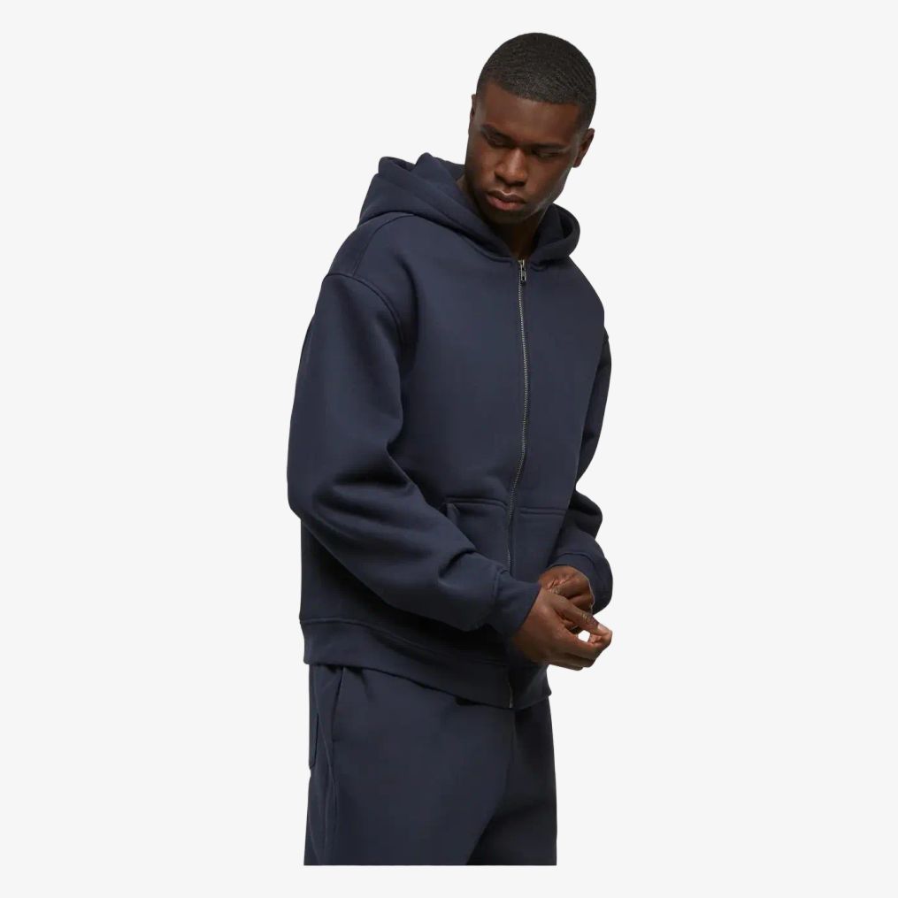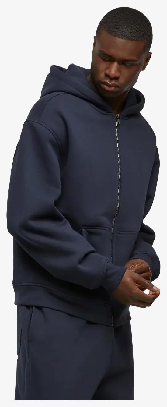 La sudadera con capucha con cremallera oversize nm013 presenta un corte amplio con hombros caídos y capucha sin cordón. Está equipada con dos bolsillos laterales y un cierre con cremallera integral. El material incluye 70 % algodón orgánico y 30 % poliéster reciclado.