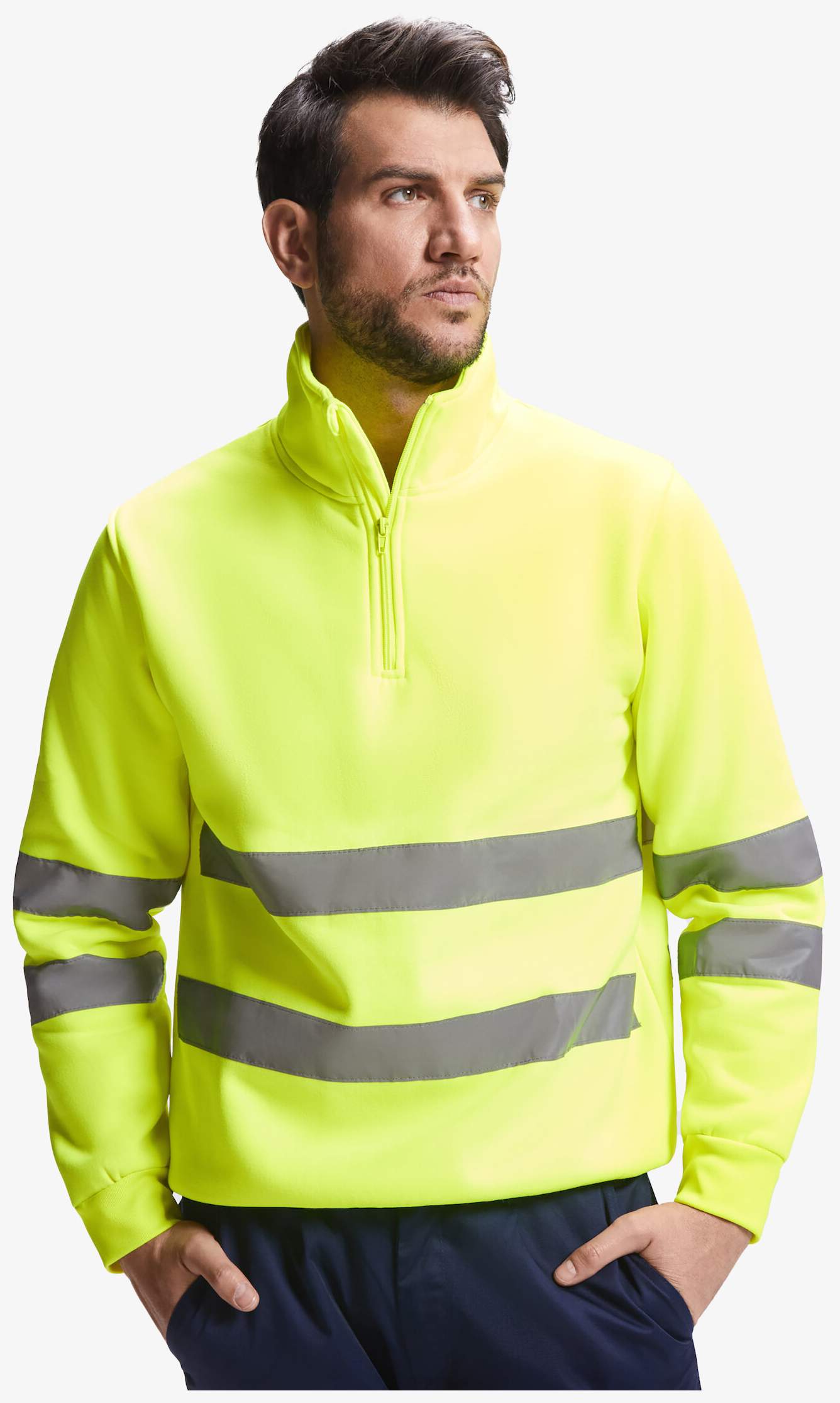 La sudadera de alta visibilidad Spica cuenta con cremallera, cuello alto con protector de barbilla y tirador. Incluye dos bandas reflectantes horizontales en el torso y las mangas, así como una banda interior reforzada en el cuello para mayor limpieza. El puño es de canalé 1x1.