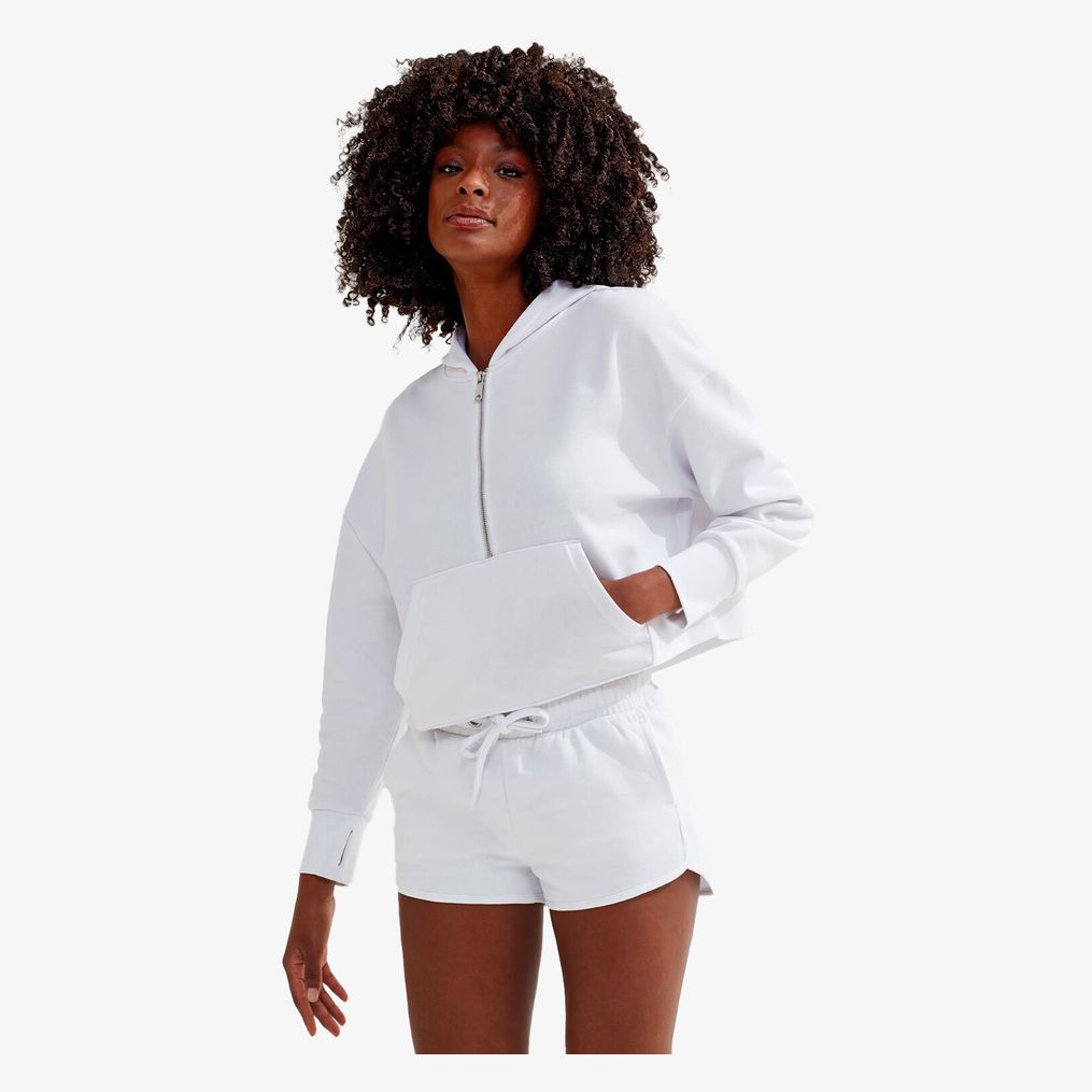 La sudadera con capucha y cremallera 1/2 para mujer está confeccionada en forro polar suave y ligero. Incluye un cierre de cremallera en el cuello, un bolsillo canguro en la parte delantera, puños acanalados con aperturas para los pulgares y un interior de felpa cepillada.