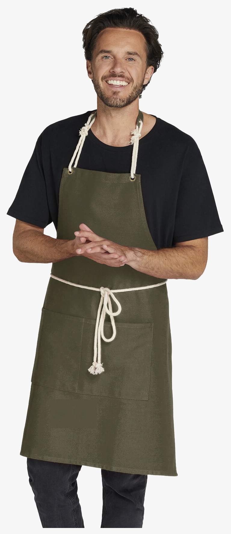 El delantal con peto Corsica está hecho de lona 100% algodón con cordones naturales ajustables que pasan por ojales de latón antiguo alrededor del cuello. Incluye un gran bolsillo central cosido dividido en dos compartimentos de 40 x 20 cm.