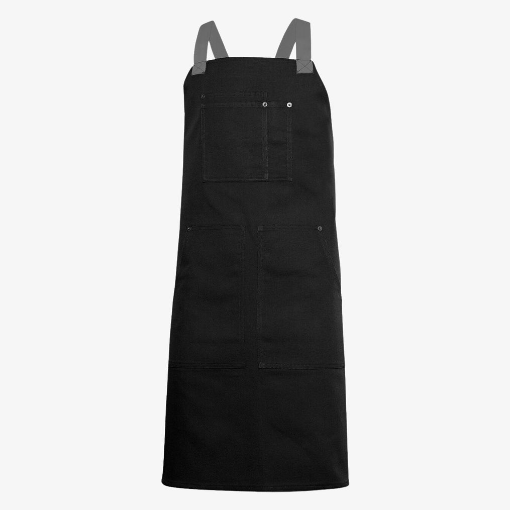 El tablier à bavette canvas combina 65% poliéster y 35% algodón. Cuenta con tirantes cruzados en la espalda y dos lazos contrastantes para ajustar.