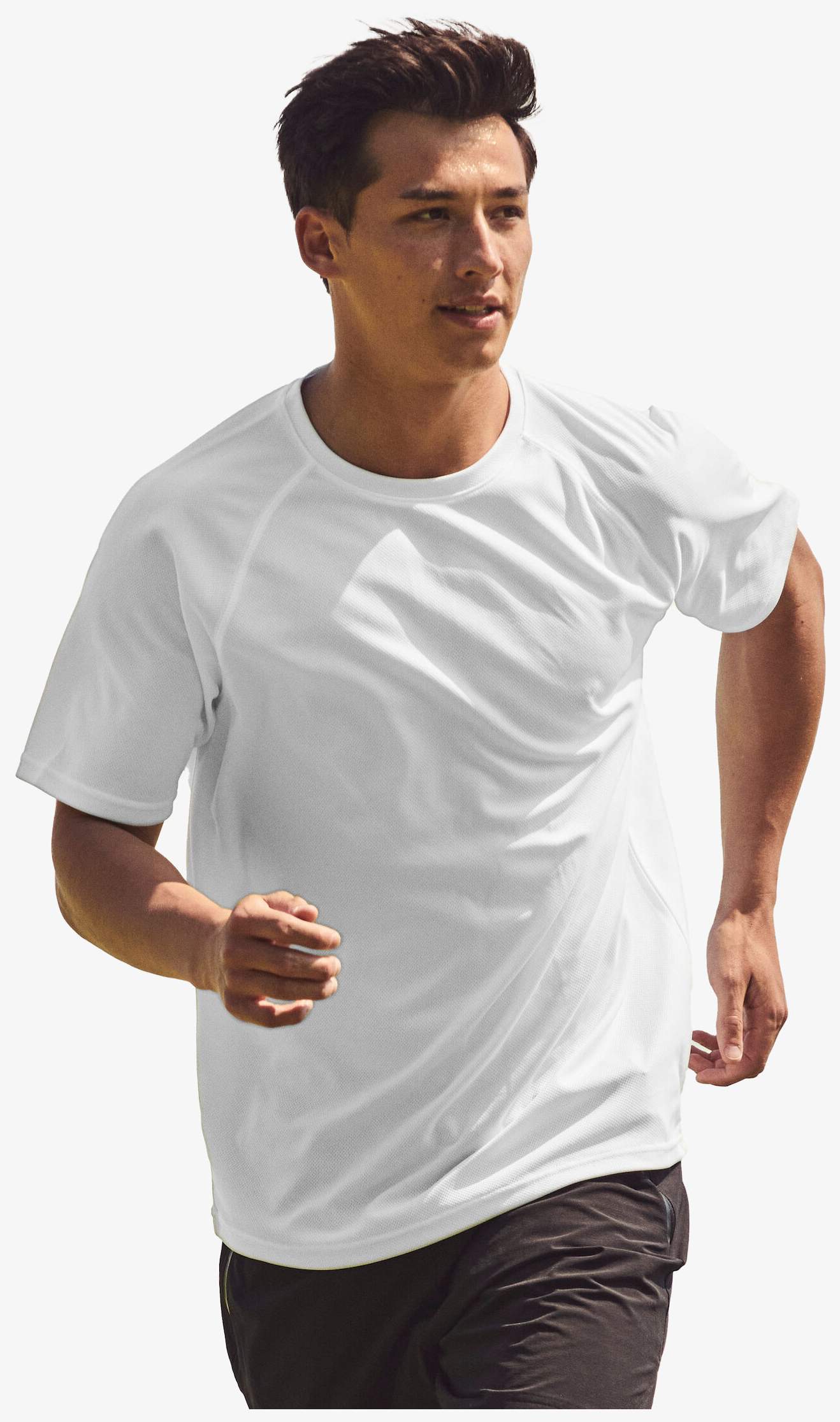 La Performance T es una camiseta de poliéster, con mangas raglán y detalle de costura visible. La etiqueta estampada en el cuello limita las rozaduras al llevarla.
