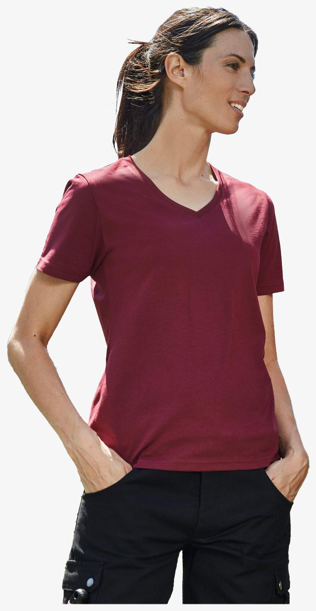 La camiseta para mujer presenta un corte ligeramente entallado y un cuello en V con elastano. Su composición de algodón orgánico hilado en anillos y poliéster asegura una forma estable y resistencia al lavado. Banda de refuerzo en el escote.