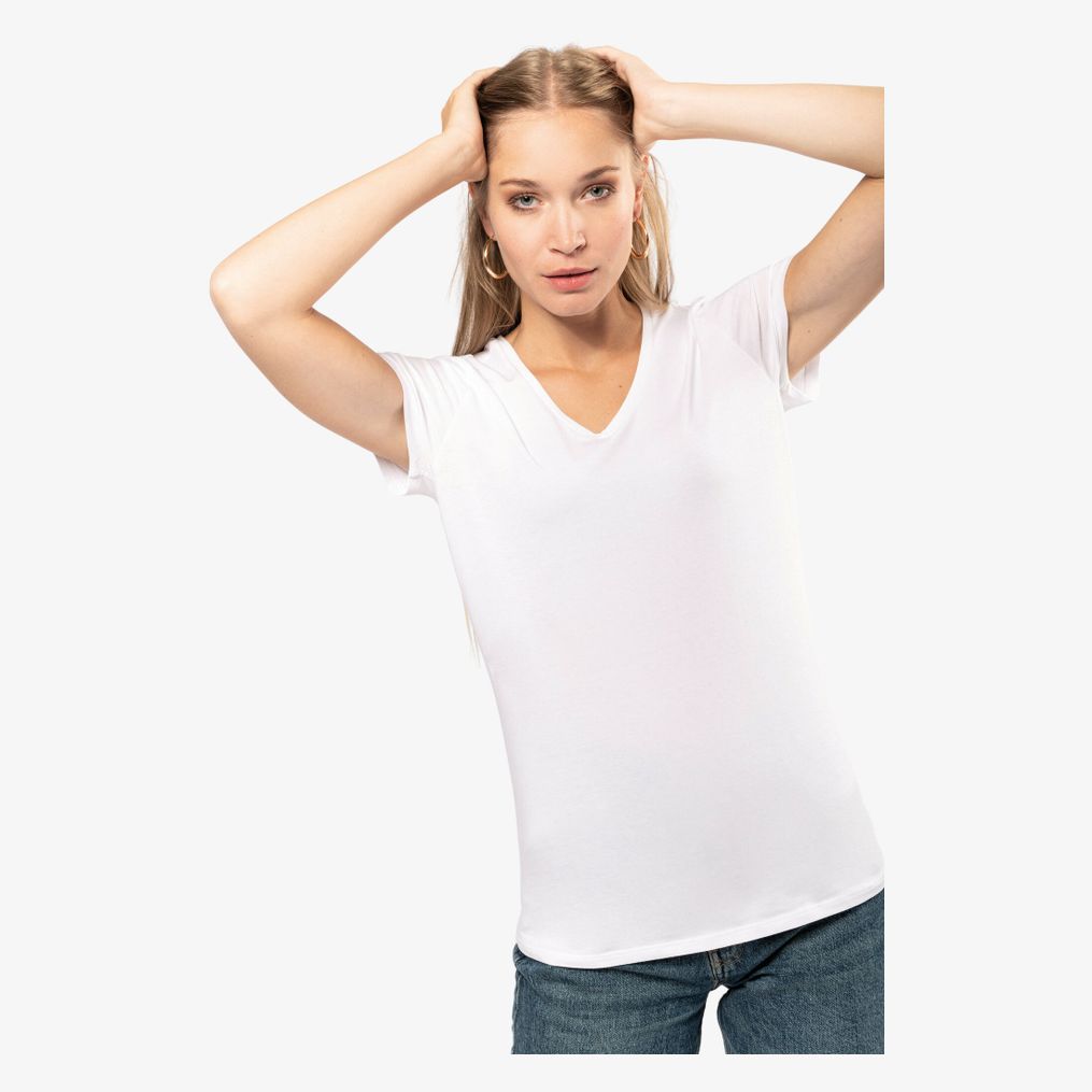 El tee-shirt de cuello en V de manga corta para mujer k3015 está compuesto por 97% algodón y 3% elastano, con colores jaspeados que contienen 87% algodón, 9% viscosa y 4% elastano. Presenta un escote en V y un acabado de doble aguja en el bajo de las mangas y de la prenda.