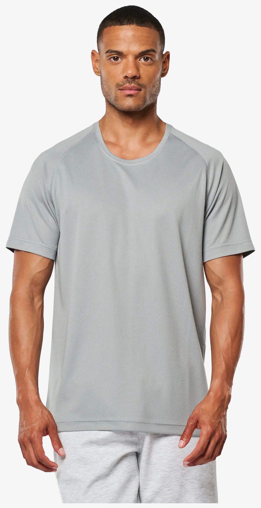 La camiseta deportiva de cuello redondo reciclada para hombre está confeccionada en tejido ligero de secado rápido con un corte recto y un escote redondo con una cinta interior contrastada. Las mangas raglán presentan costuras tono sobre tono. El acabado incluye costuras dobles en el escote, en el bajo de las mangas y un dobladillo tubular.