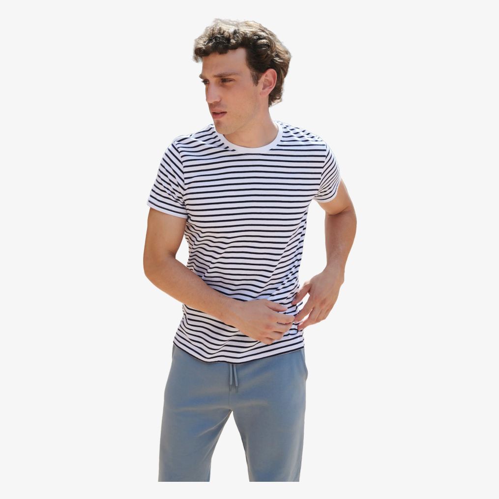 La camiseta de algodón unisex a rayas está diseñada con una etiqueta desprendible y un cuello Stretch®. La composición es 100% algodón excepto para el color heather grey/white que es 85% algodón y 15% viscosa.