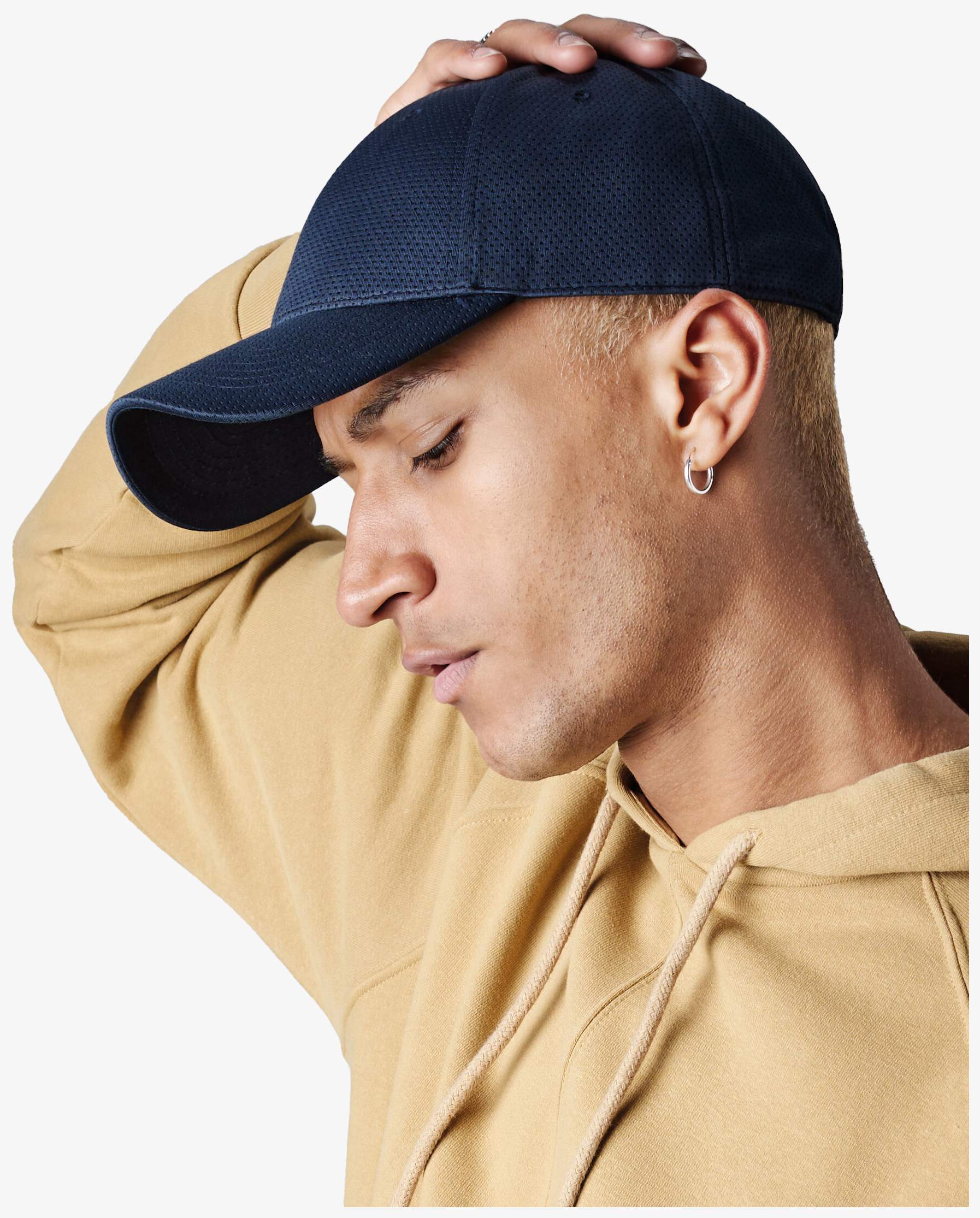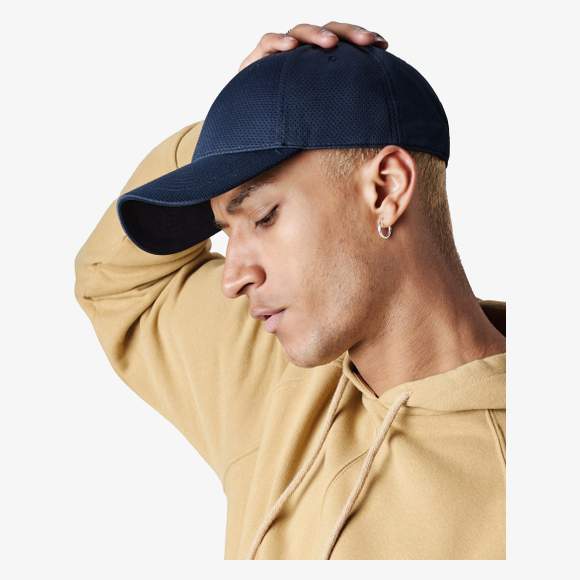 Il berretto a 6 pannelli è strutturato nella parte anteriore con una visiera precurvata e una fascia di serraggio regolabile con fibbia. Include fori di aerazione ricamati e un'etichetta rimovibile. Taglia unica.
