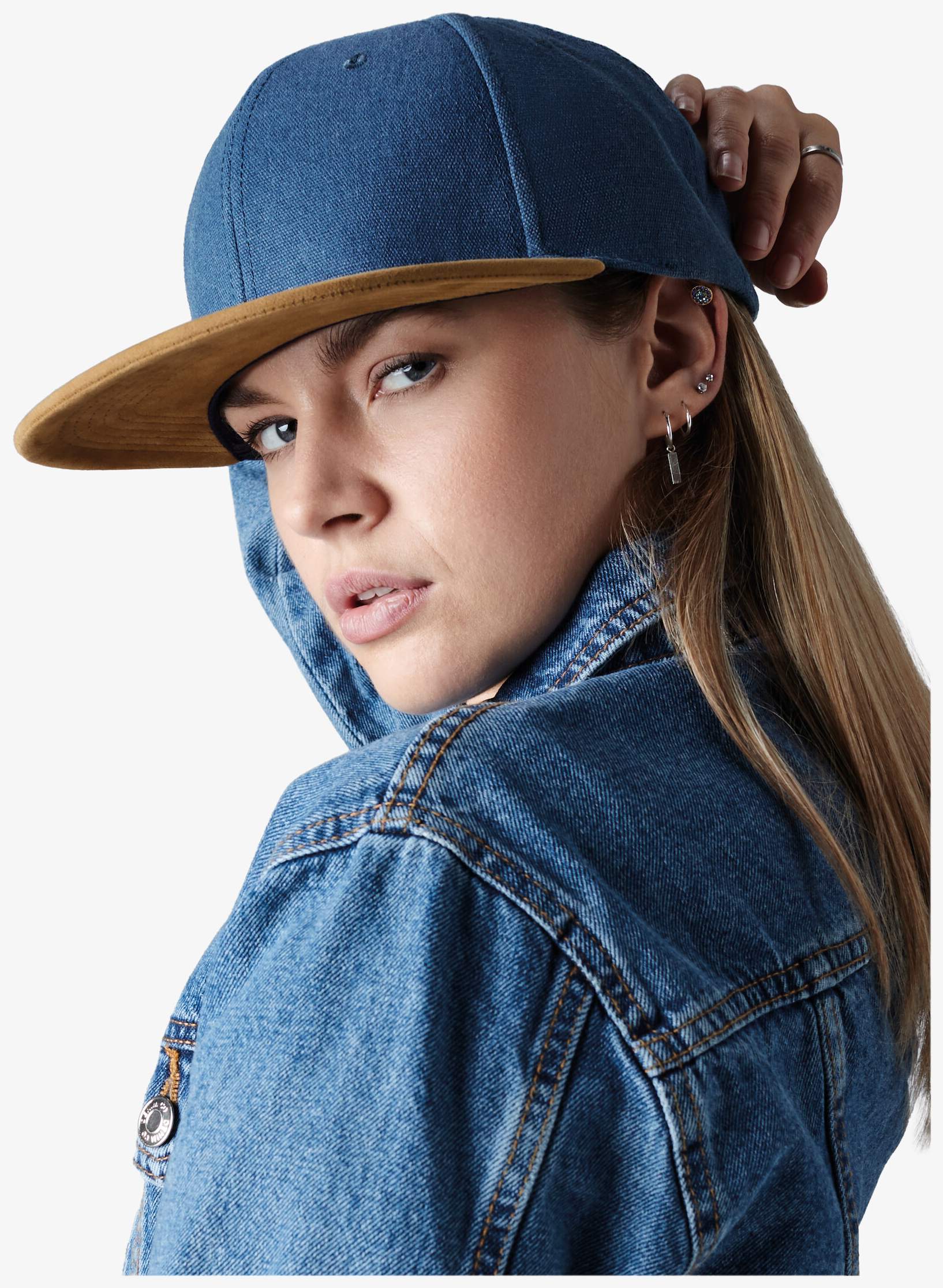 Il cappellino a 6 pannelli ha una visiera piatta in finta pelle scamosciata e fori di aerazione ricamati. Si regola con una chiusura in plastica a taglia regolabile e ha un'etichetta staccabile.