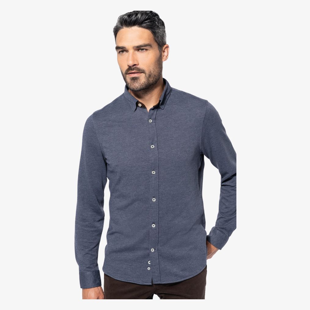 La camicia a maniche lunghe è realizzata in maglia jacquard composta da 68% cotone e 32% poliestere. Presenta un piedino del colletto in scamosciato a contrasto e una pattina classica con bottoni effetto madreperla. I polsini sono regolabili con bottoni effetto madreperla. L'orlo è arrotondato.