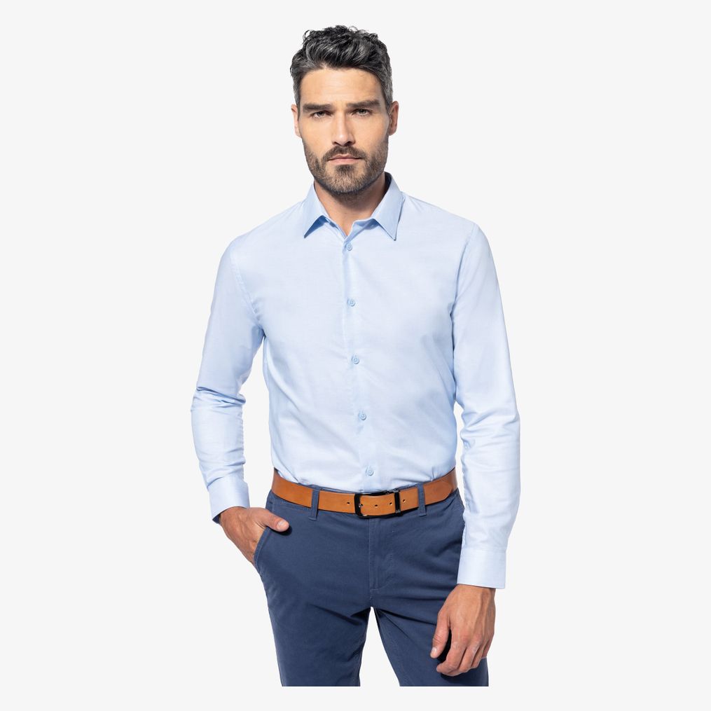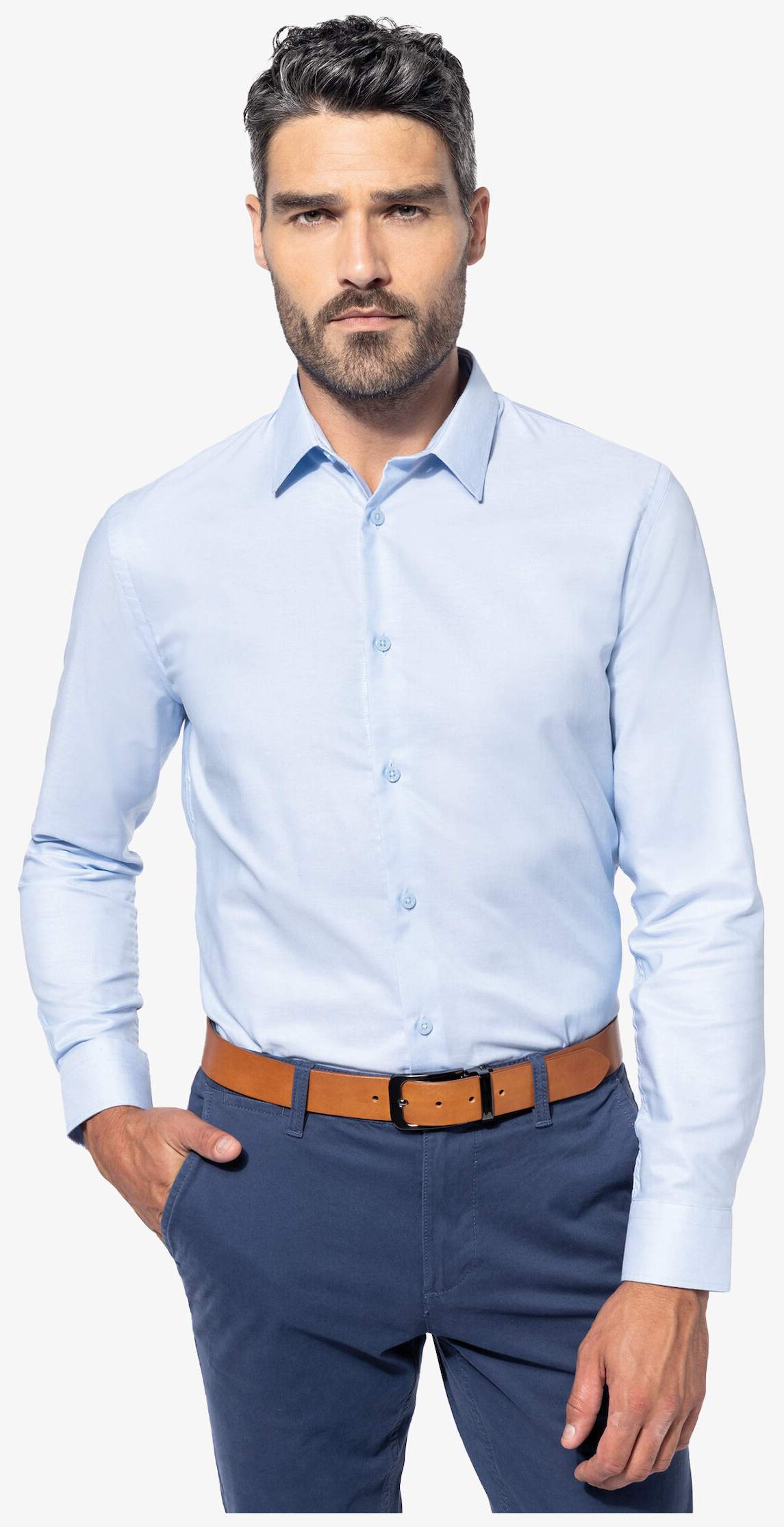Camicia oxford maniche lunghe uomo realizzata con tessuto oxford misto 70% cotone 30% poliestere. Presenta un taglio aderente, colletto con stecche, patta di abbottonatura con bottoni in plastica tono su tono e rinforzo sulla parte alta della schiena.