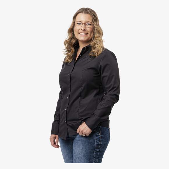 La camicia maniche lunghe da donna presenta un collo Kent e maniche lunghe. Realizzata in 100% cotone con vari tipi di tessuto a seconda del colore: popeline per white, navy, black e chambray per blue, anthracite.