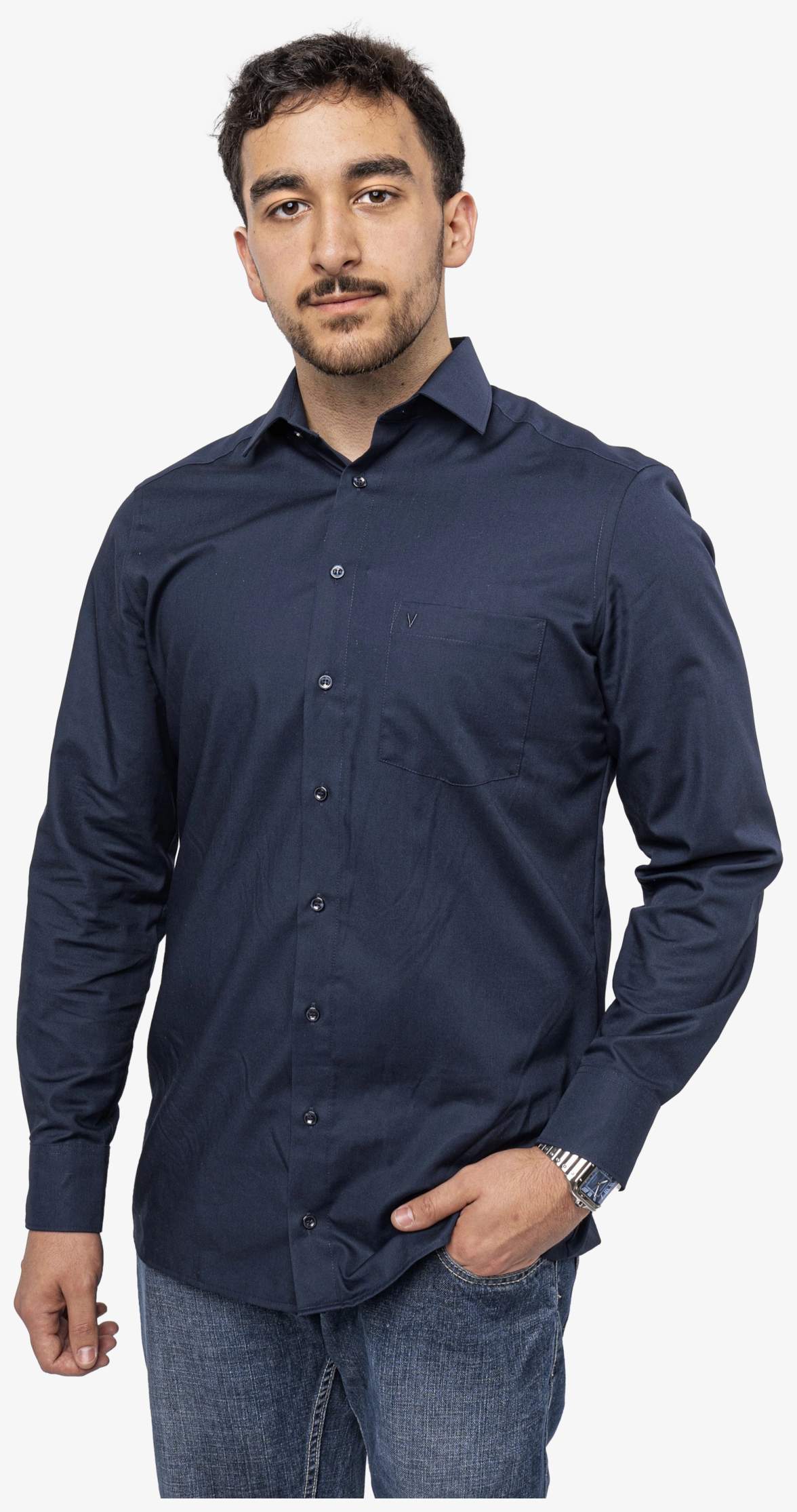 La camicia uomo a maniche lunghe ha un taglio moderno con collo Kent e taschino ricamato. È realizzata con maniche extra lunghe e tessuto senza bisogno di stiratura. La composizione varia a seconda dei colori: 100% popeline per bianco, navy, nero; 100% chambray per blu e antracite.