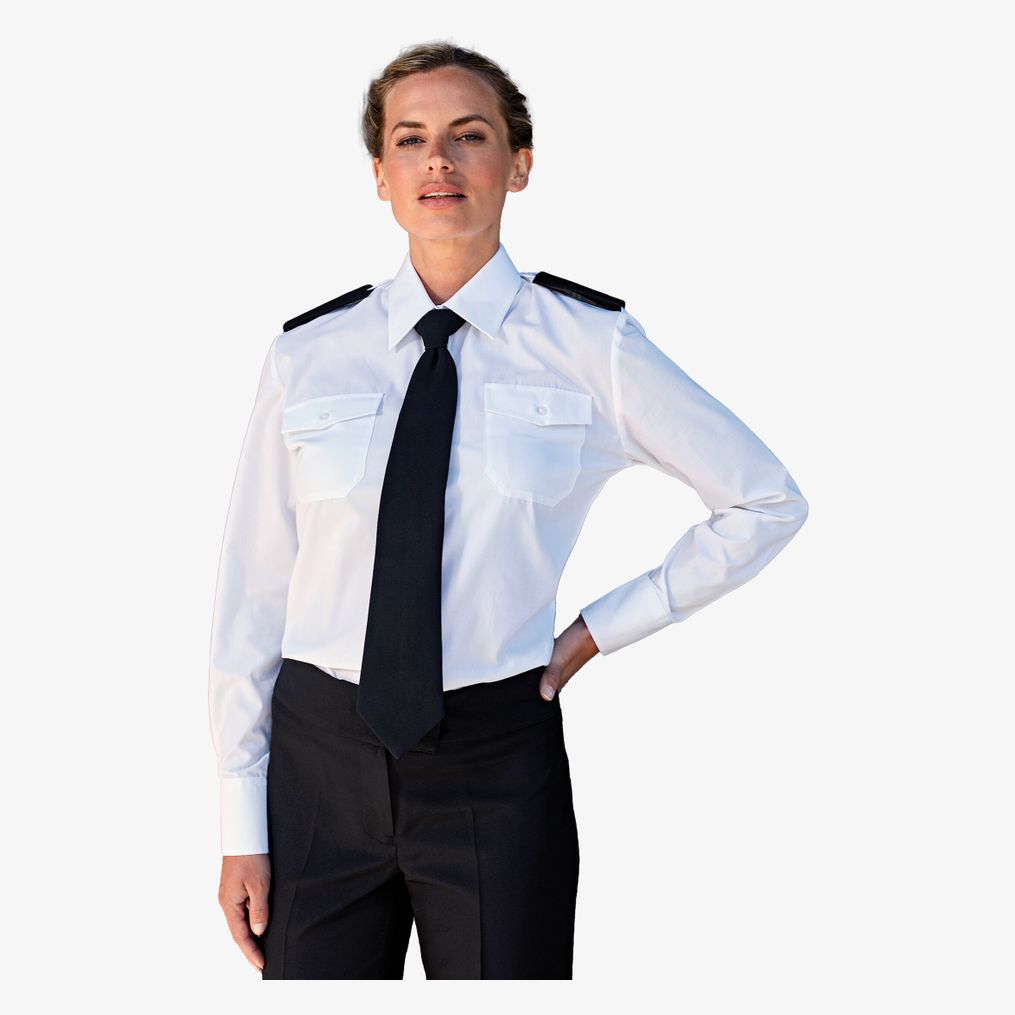 La chemise pilote à manches longues pour femme si distingue per un colletto rinforzato rigido adatto per l'applicazione di una cravatta a clip. Comprende due tasche sul petto con pattine, una delle quali con tasca combinata per penna. Sono presenti linguette sulle spalle per aggiungere spalline. Il tessuto è composto da 65% poliestere e 35% cotone.