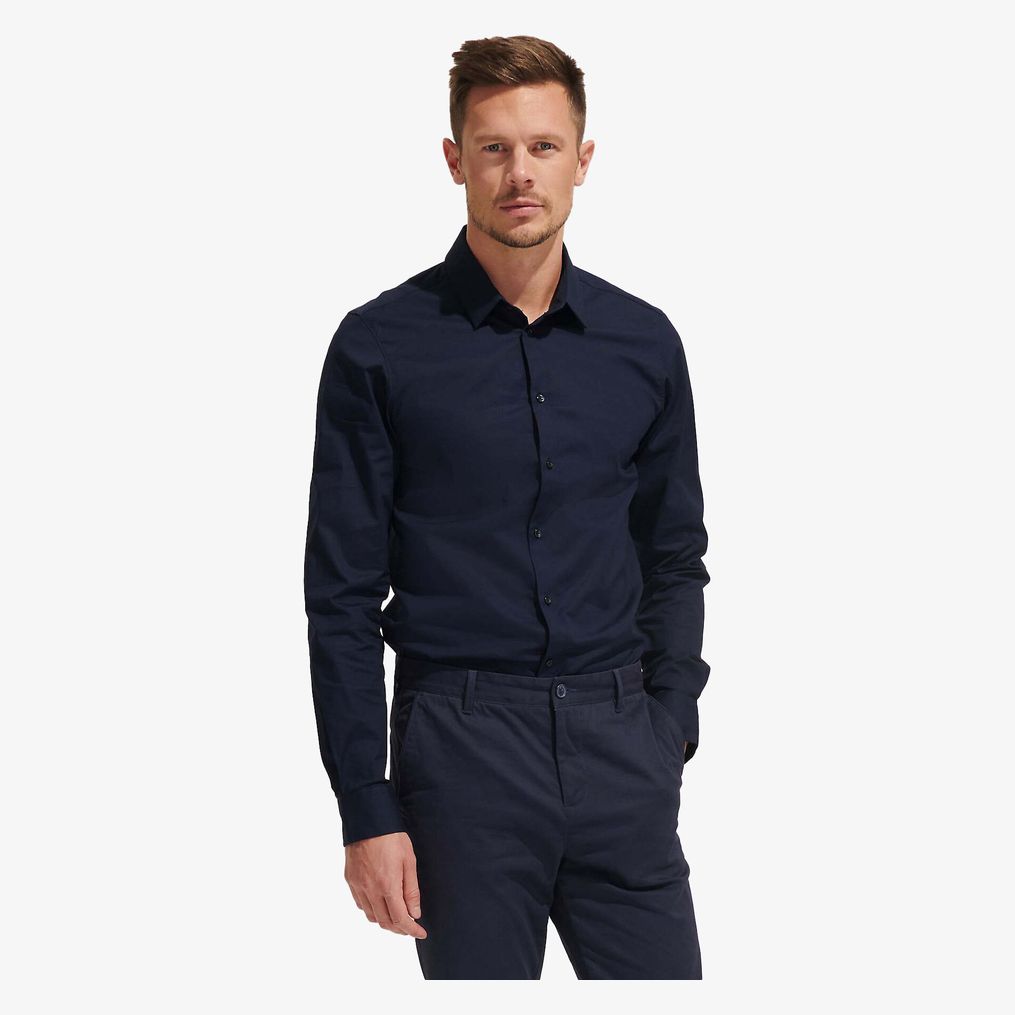 La camicia uomo stretch ha un taglio aderente con 2 pince in vita sul retro, un colletto classico moderno e una patta con 8 bottoni tono su tono. La composizione è 97% cotone e 3% elastan.
