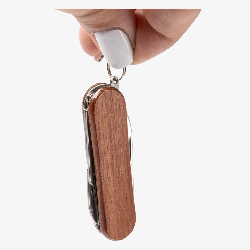 Il coltello in acciaio inox con manico in legno racchiude tre funzioni: lama affilata per tagli precisi, forbici integrate per materiali sottili, limetta per superfici ruvide.