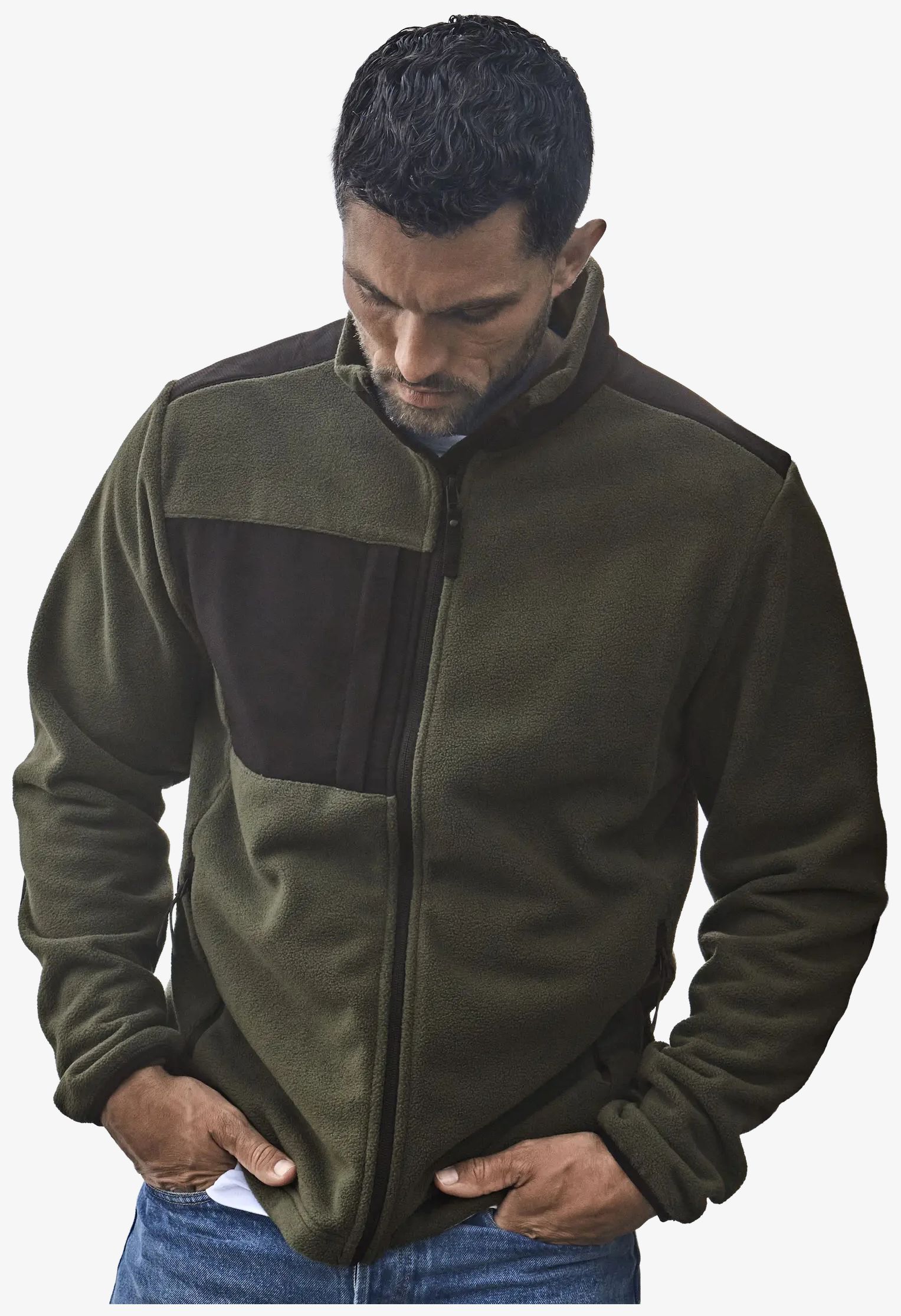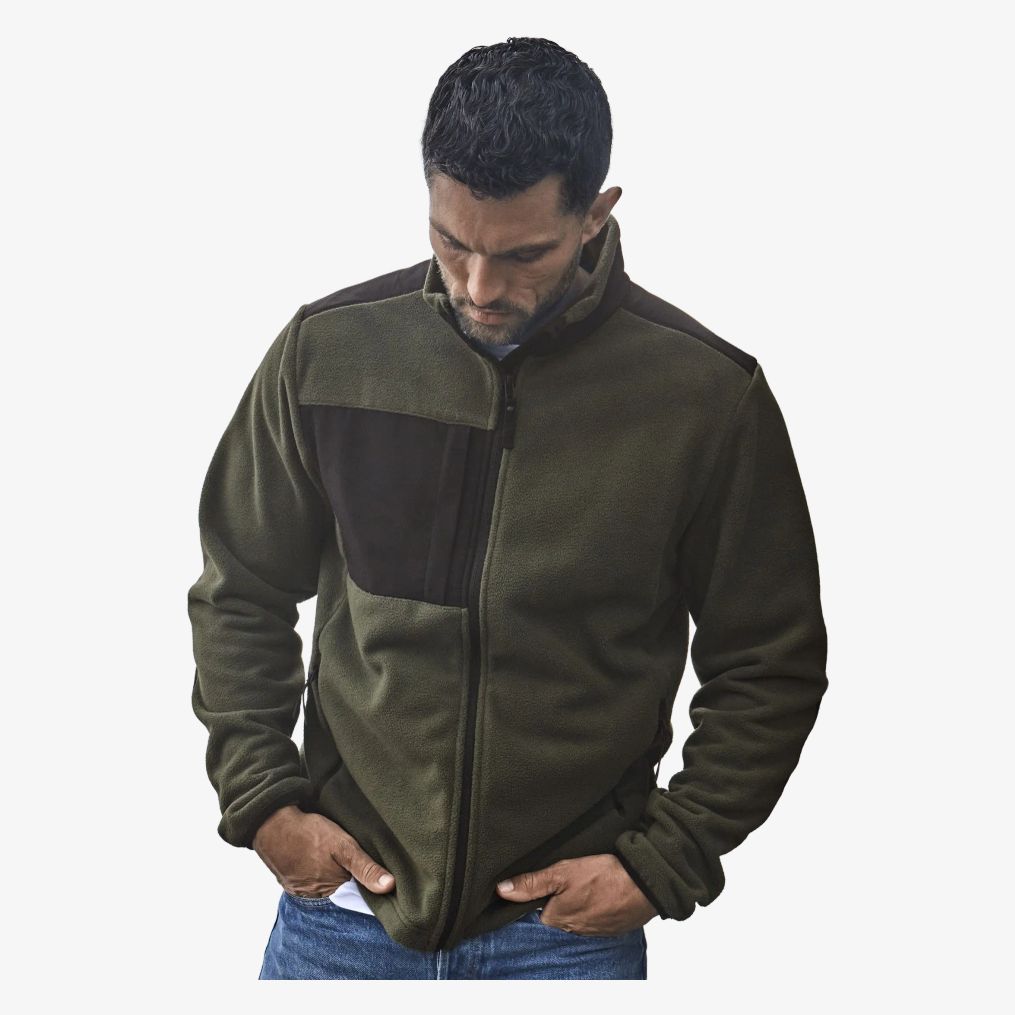 Il pile spesso Mountain fleece è realizzato con rinforzi su spalle e gomiti. Include una tasca sul petto, due grandi tasche frontali con cerniera e bordi elasticizzati alle maniche.