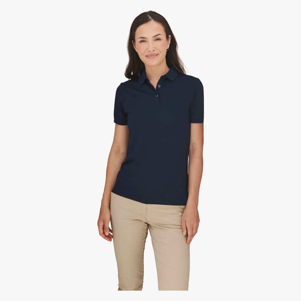 La polo donna in poliestere riciclato ha un collo alto e una patta a 3 bottoni. Presenta una vestibilit\u00e0 femminile grazie alle cuciture laterali sagomate. Il collo e i bordi delle maniche sono a costine 1 x 1.