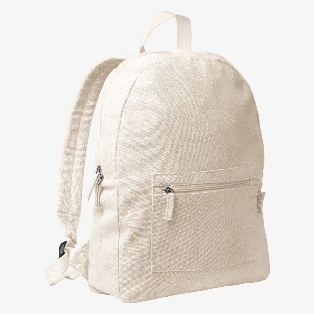 Lo zaino in cotone riciclato si caratterizza per un design melange e una capacità di 12 L. Comprende una tasca frontale e spallacci imbottiti per un trasporto confortevole.