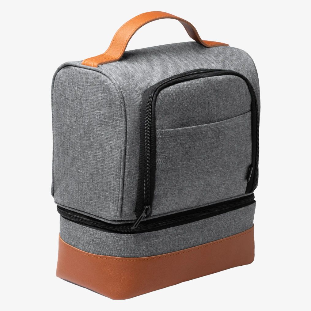 La borsa termica in poliestere RPET presenta un design mélange con doppio scomparto indipendente e chiusura a zip. Comprende una fodera termica e manici in pelle PU.