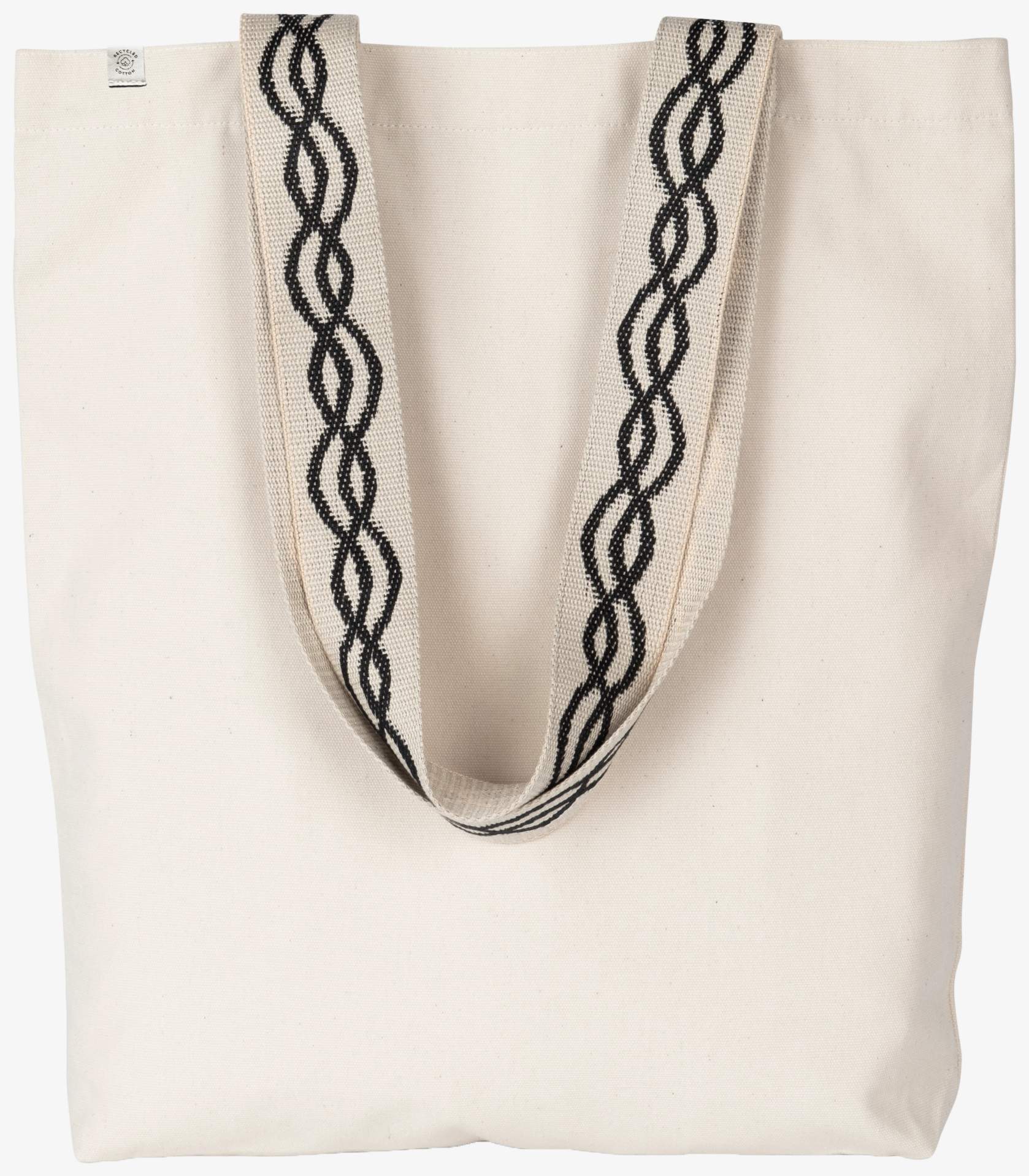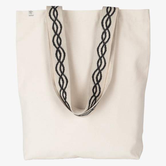La borsa shopping riciclata si distingue per i suoi manici a motivi a linee intrecciate che misurano 60 cm di lunghezza e 4,25 cm di larghezza. La sua capacità è di 12 litri per dimensioni di 38 cm per 42 cm.