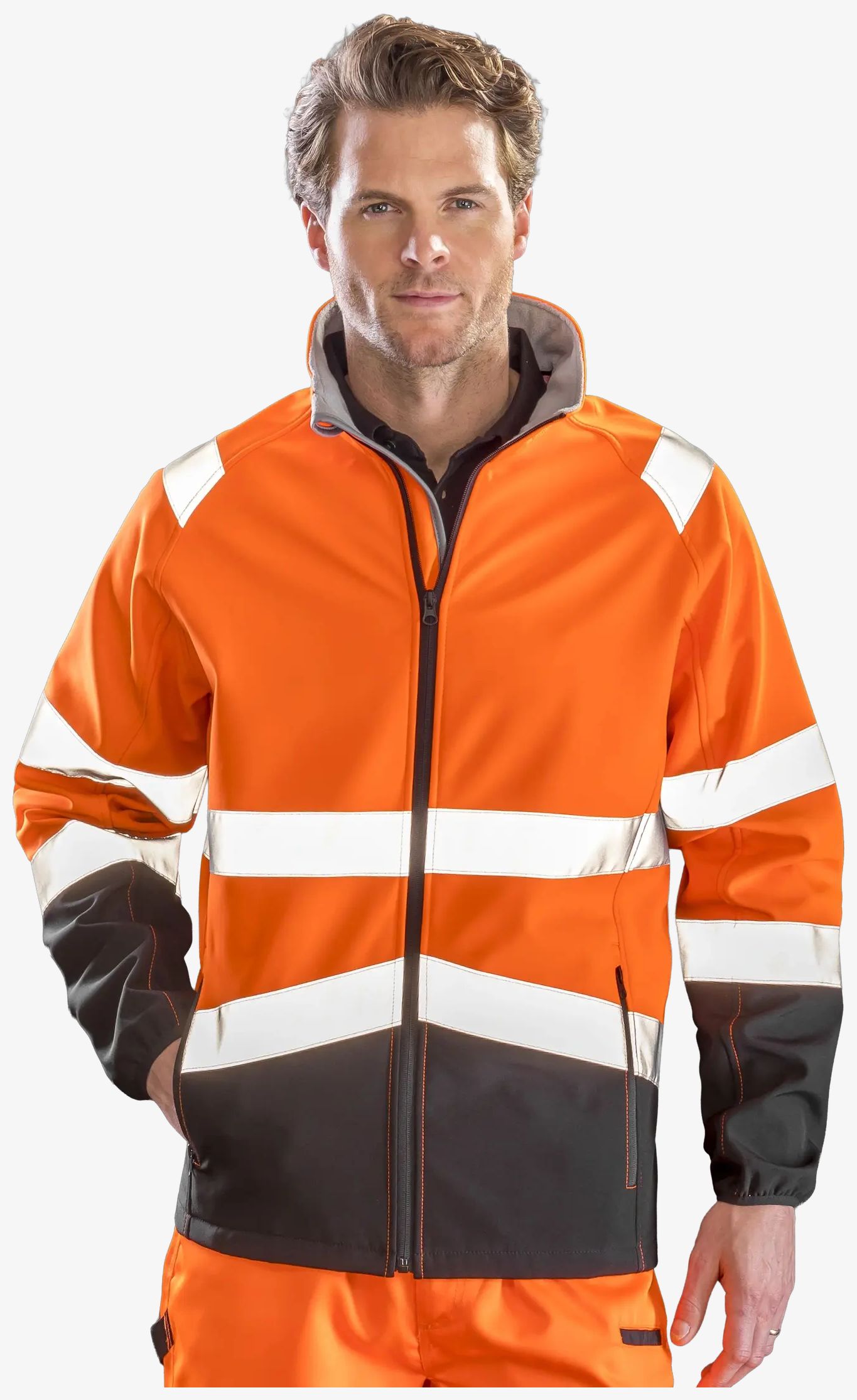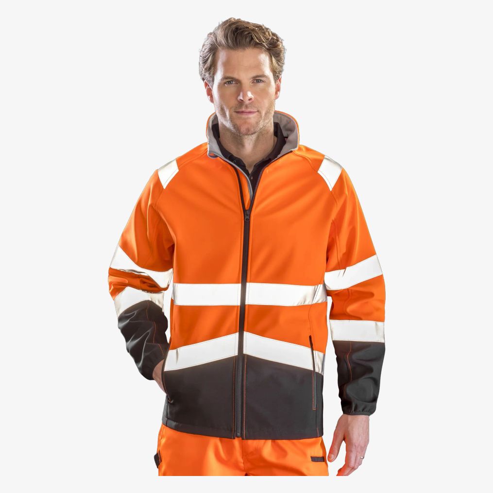 Il Printable Safety Softshell è un softshell leggero e caldo, adatto a un utilizzo esterno grazie alla sua struttura antivento, al collo alto e alle tasche laterali con zip. I dettagli riflettenti sul corpo, sulle spalle e sulle braccia migliorano la visibilità, mentre la parte inferiore nera delle maniche limita i segni visibili.