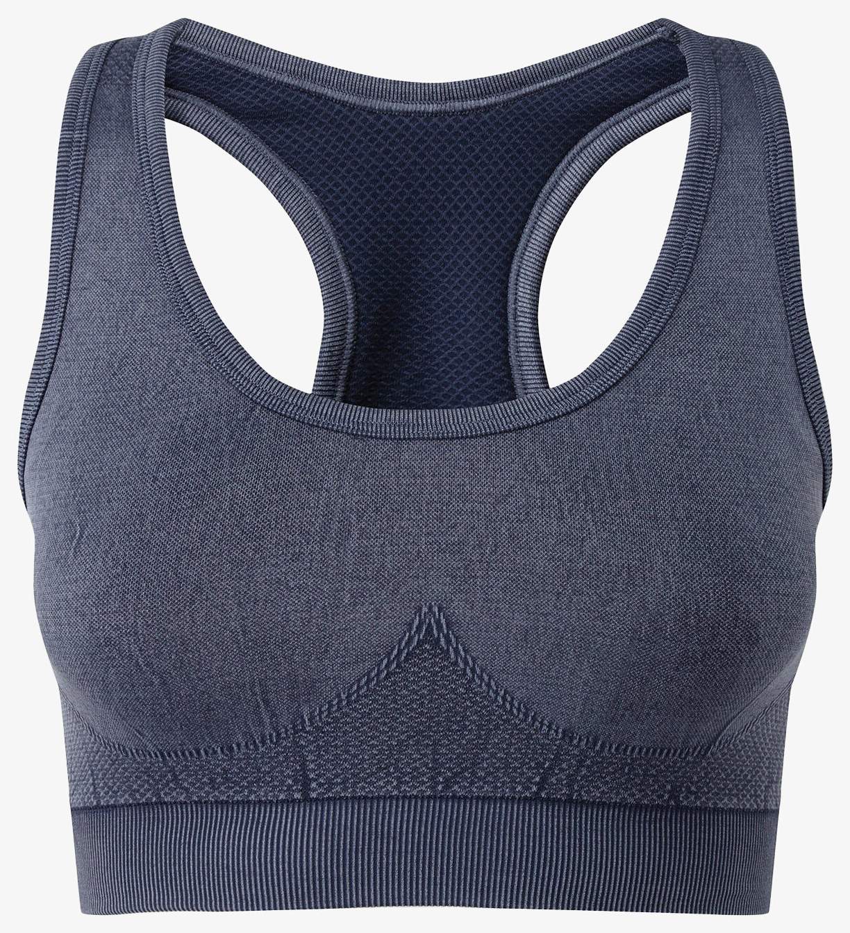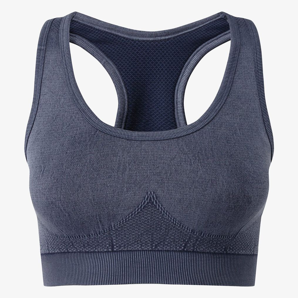 Il reggiseno donna Tridri\u00ae senza cuciture con aspetto denim combina tecnologia senza cuciture e cintura aumentata per un sostegno adeguato e una maggiore libert\u00e0 di movimento. Presenta un dettaglio scultura corpo e non possiede etichetta di collo visibile.