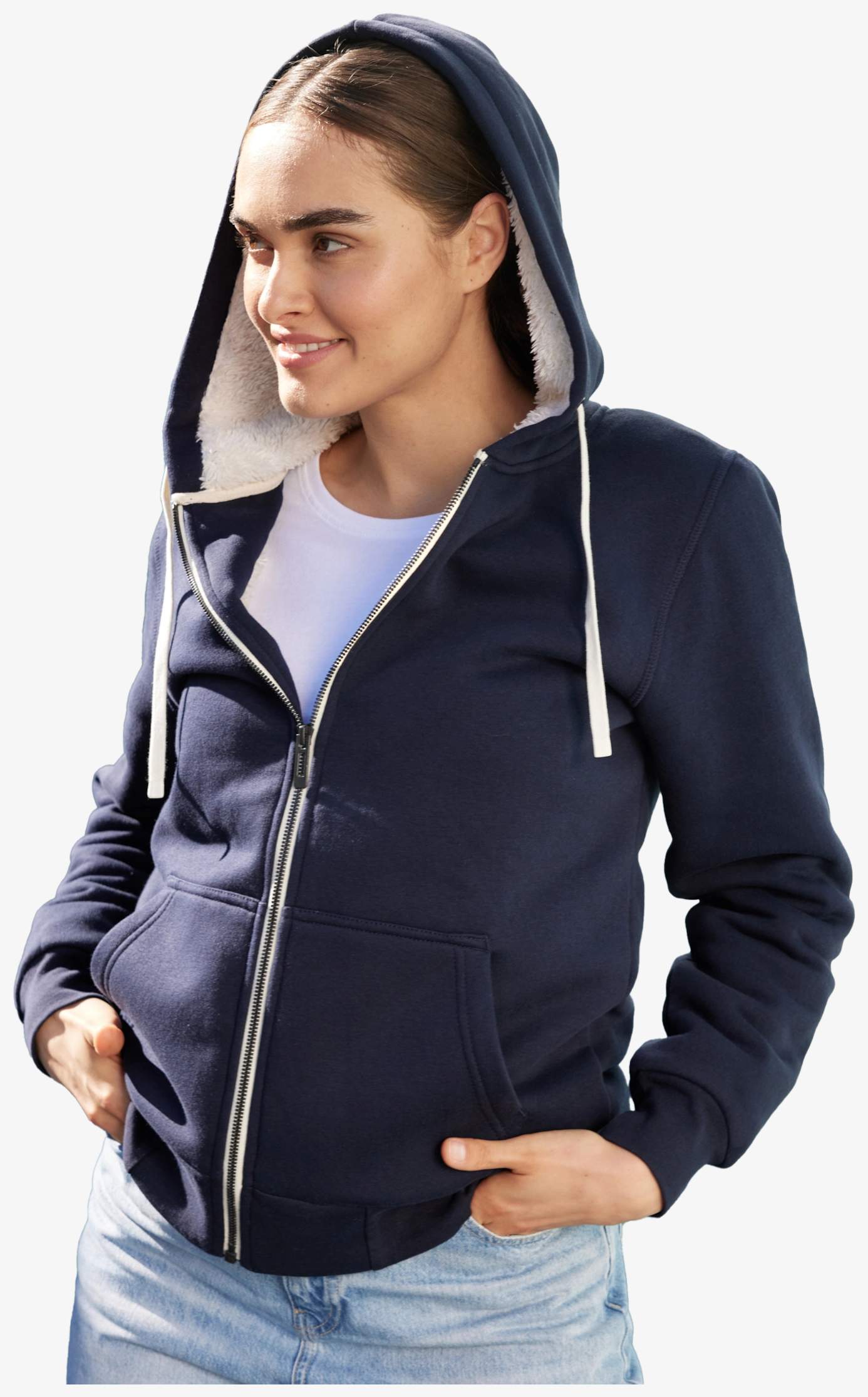 La Ladies' Doubleface Jacket è una felpa con cappuccio con fodera sherpa in poliestere riciclato. Include un cappuccio con cordino, chiusura lampo, e una tasca kangaroo.