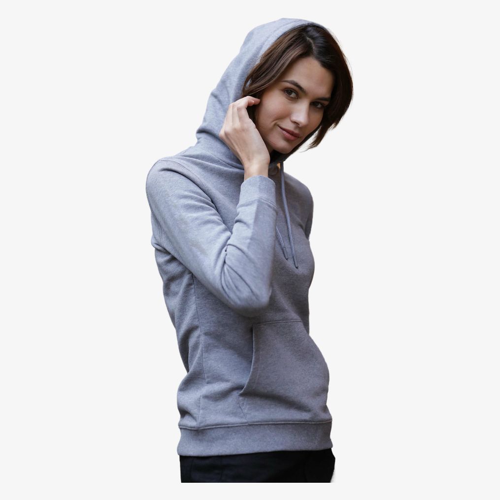 La felpa con cappuccio da donna comprende una tasca a marsupio e un cappuccio con cordini di regolazione. Gli occhielli hanno terminali abbinati al colore del tessuto. La fodera è in jersey. Le rifiniture a costine 2x2 sono posizionate ai polsini e al fondo. Una mezzaluna di rinforzo è presente all'interno del colletto. Il tessuto è in French Terry.