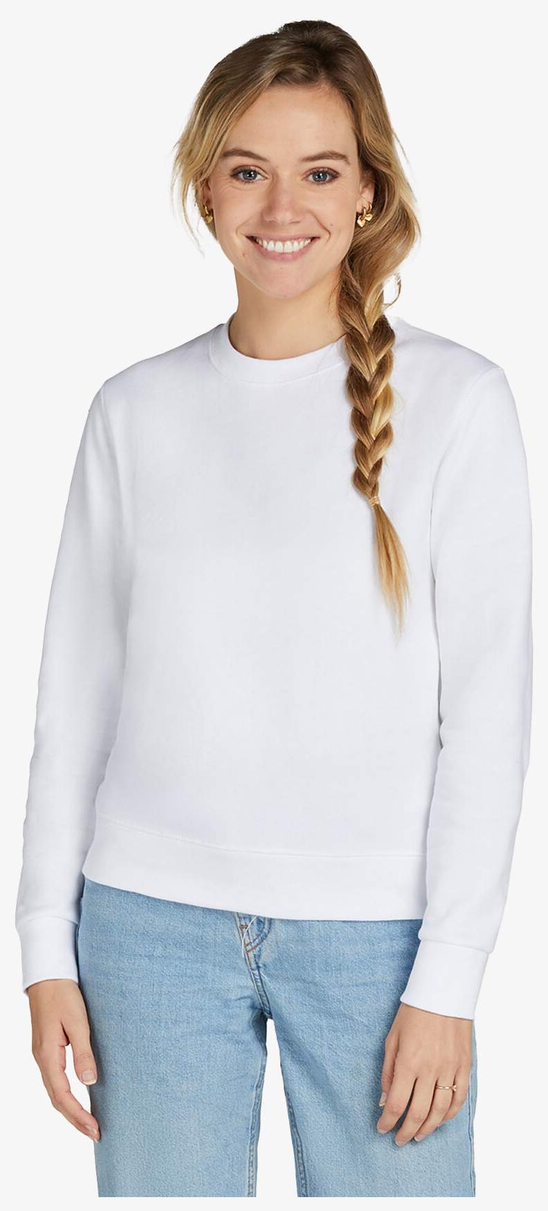 La felpa girocollo da donna è progettata con un taglio dotato di cuciture laterali. Le finiture includono bordi a costine su collo, polsini e orlo. L'interno è in pile spazzolato per una sensazione morbida.