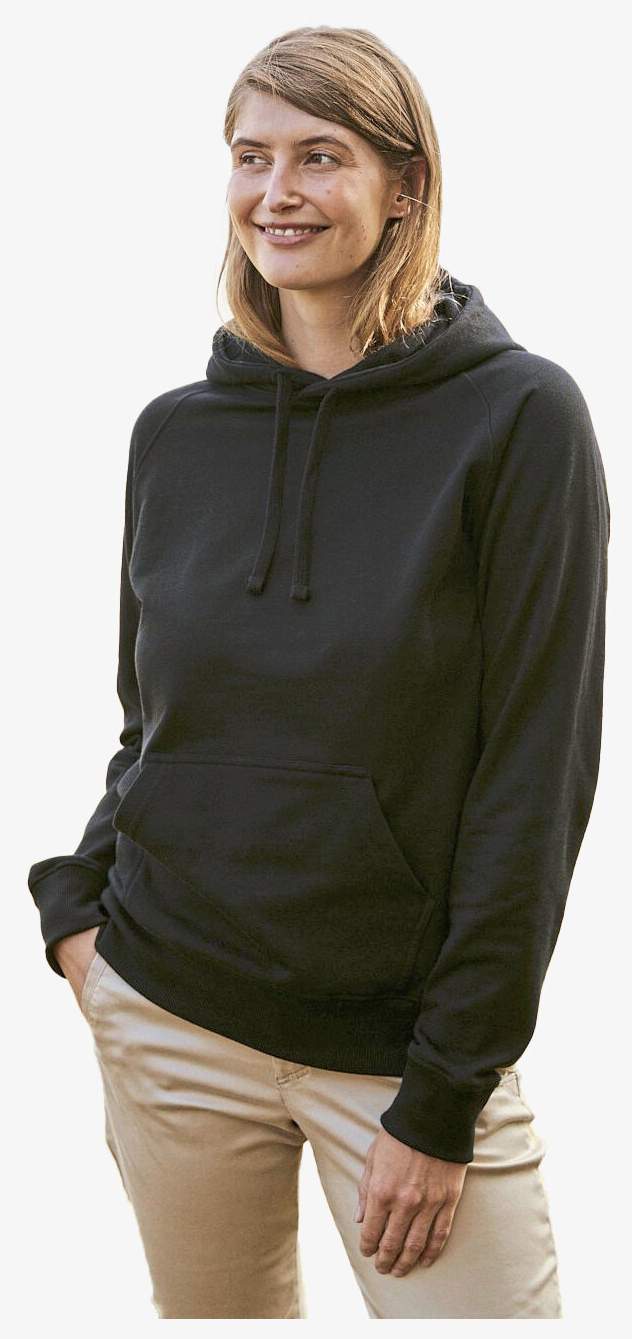 La felpa con cappuccio spessa include una tasca a marsupio frontale e un cappuccio doppio foderato con coulisse piatte regolabili. Presenza di un nastro di rinforzo all'interno del colletto e bordi a doppio spessore ai polsini e al fondo. Interno morbido e spazzolato.