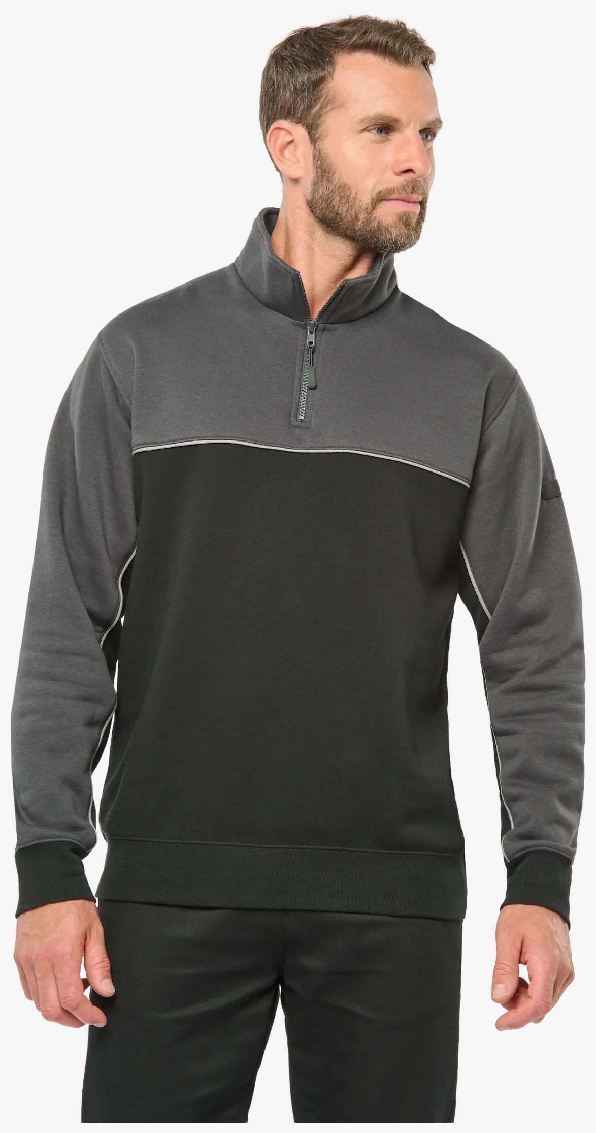La felpa ecologica con collo zip unisex è realizzata in tessuto spazzolato per una sensazione di morbidezza e un comfort aumentato. La confezione a 3 fili LSF contribuisce alla stabilità dimensionale e alla resistenza al lavaggio. Il taglio è aderente con maniche montate e collo con zip in plastica riciclata tono su tono. La banda di rifinitura a contrasto e il piping tra le parti bicolor conferiscono una finitura curata.
