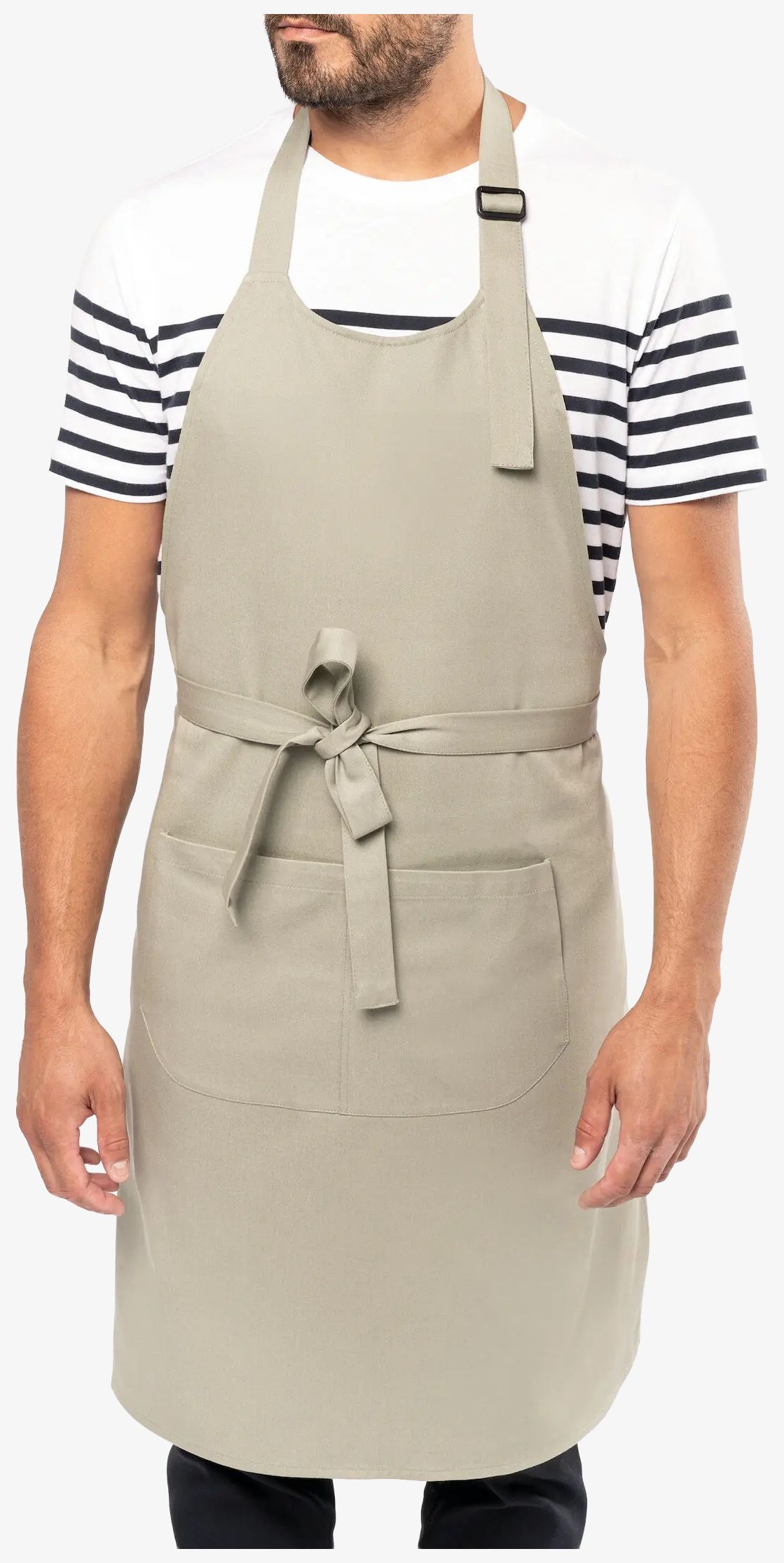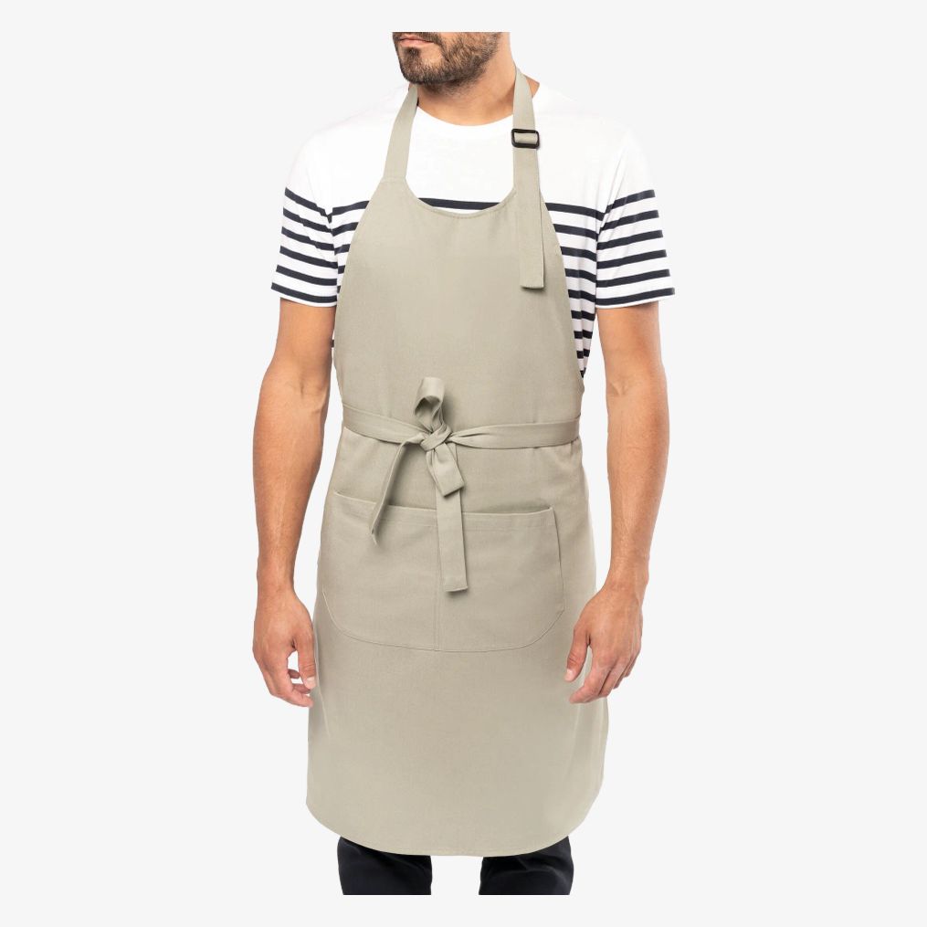 Il grembiule con tasca in cotone biologico comprende una fibbia regolabile in plastica riciclata al livello del collo per regolare la lunghezza e una grande tasca frontale divisa in due scomparti.
