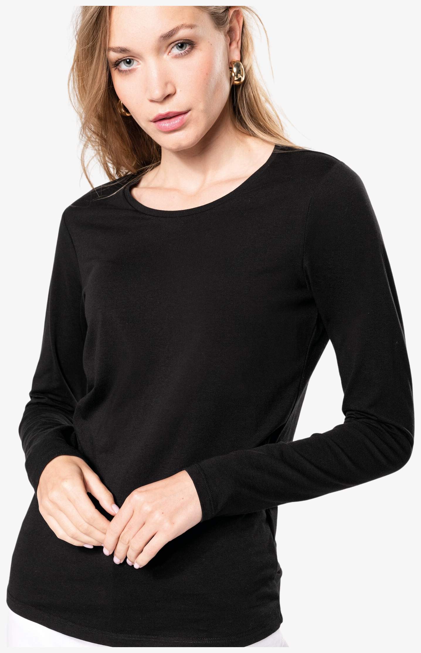 La tee-shirt donna a collo tondo maniche lunghe combina principalmente cotone ed elastan per una struttura leggermente elastica. I colori mélange hanno una composizione diversa con viscosa. La scollatura è rotonda e le finiture presentano una doppia cucitura sui bordi delle maniche e del capo.
