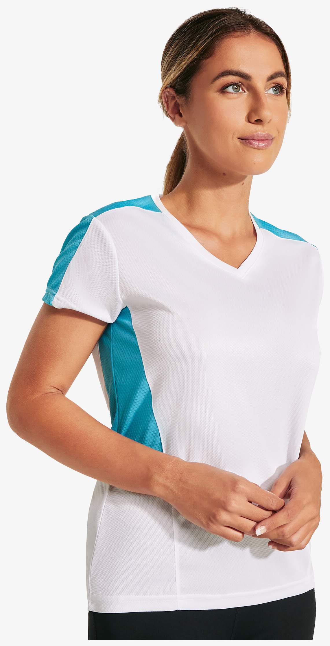 La tee-shirt Suzuka maniche corte da donna ha uno scollo a V e combina due tessuti in poliestere. Il tessuto principale è in bird's eye 3D traspirante con pannelli laterali e spalle in tessuto 3D. Assorbe l'umidità con asciugatura facilitata.