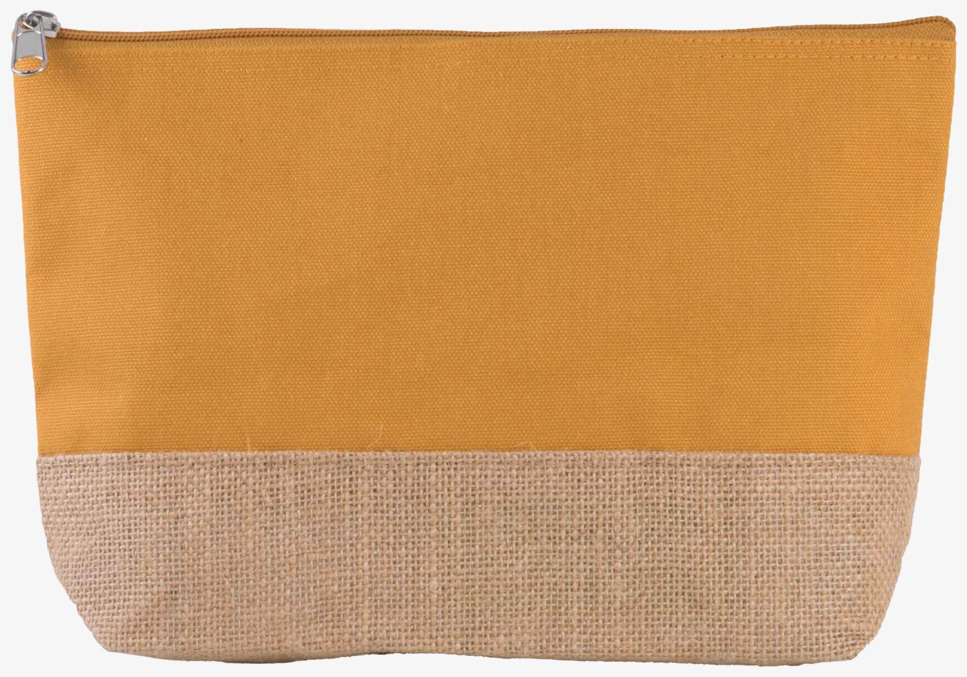 La pochette in tela di cotone con base a contrasto in juta naturale laminata combina due materiali distinti. Le sue dimensioni sono 27 cm x 5 cm x 18 cm e dispone di una capacità di 3 litri.