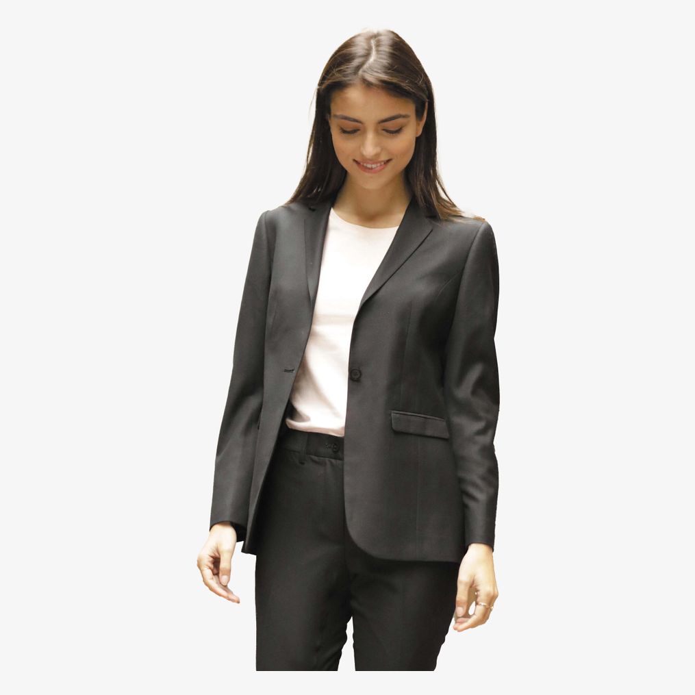 De damescolbertjas heeft een reverskraag, een enkele knop en twee klepzakken aan de zijkant. Hij bevat een binnenrits en een split in het midden van de rug. De hoofden stof is twill, bestaande uit 66% polyester en 34% viscose. De voering is 100% polyester taft 210T.