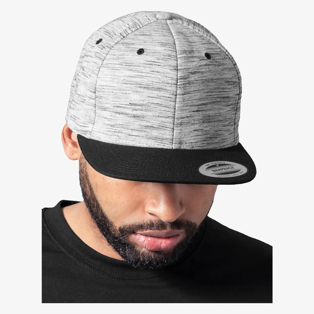 De snapback pet heeft een kroon van gemêleerde stof en een verstevigd voorpaneel. Hij heeft een snap-sluiting in bijpassende kleur. De buitenstof bestaat uit twee verschillende materialen met een mix van synthetische en natuurlijke vezels.