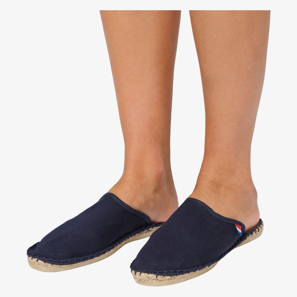 mules espadrilles zijn gemaakt van 100% katoenen canvas met een zool van gevulkaniseerd rubber en jute. De biaisafwerking bevat een geweven driemaandsvlaglabel aan de linkerkant. Franse fabricage.