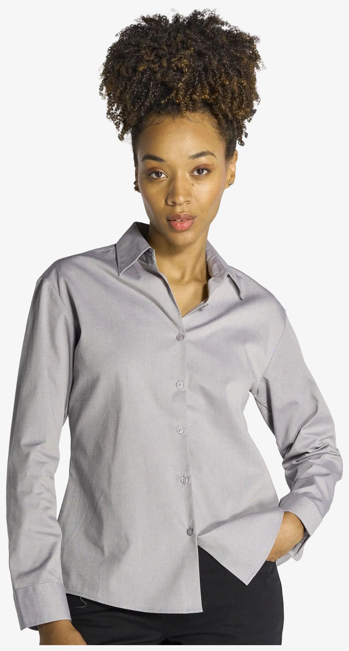 Het Oxford damesoverhemd is ontworpen voor een getailleerde pasvorm met lange mouwen en knopen in dezelfde kleur. Het combineert katoen en polyester voor veelzijdig gebruik.