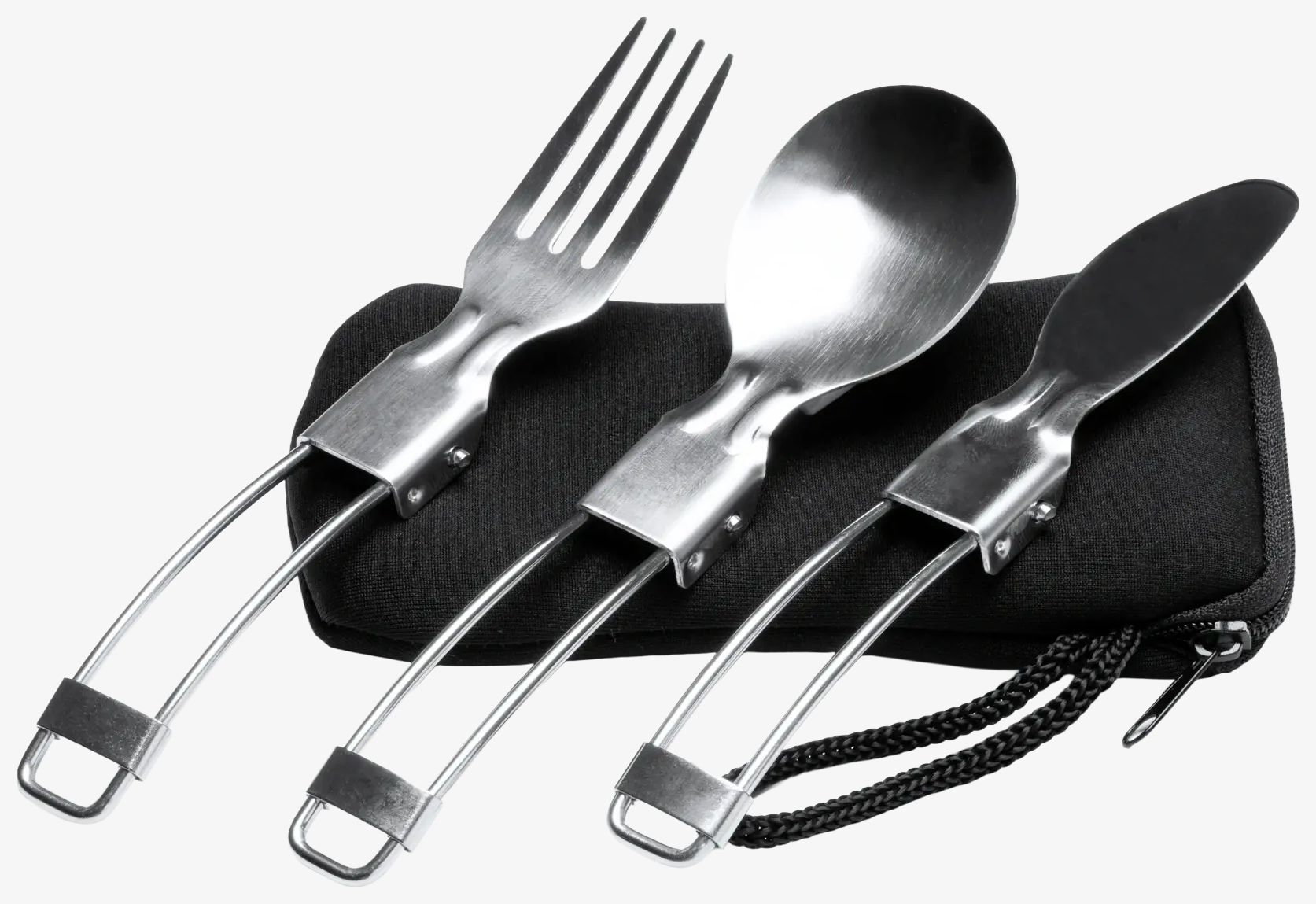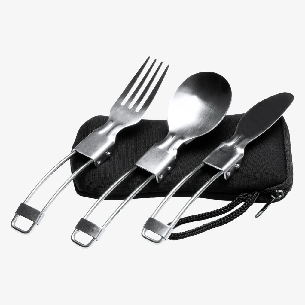 Het set opvouwbaar bestek van roestvrij staal bevat een vork, mes en lepel opgeborgen in een neopreen hoes.