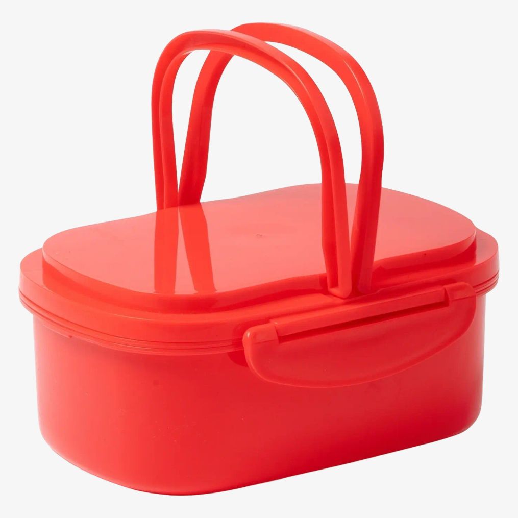 De polypropyleen lunchbox bevat een hoofdcompartiment van 1 liter en een afneembaar binnenklep met twee compartimenten om voedsel te organiseren. Het is voorzien van handgrepen voor gemakkelijke hantering en vervoer.